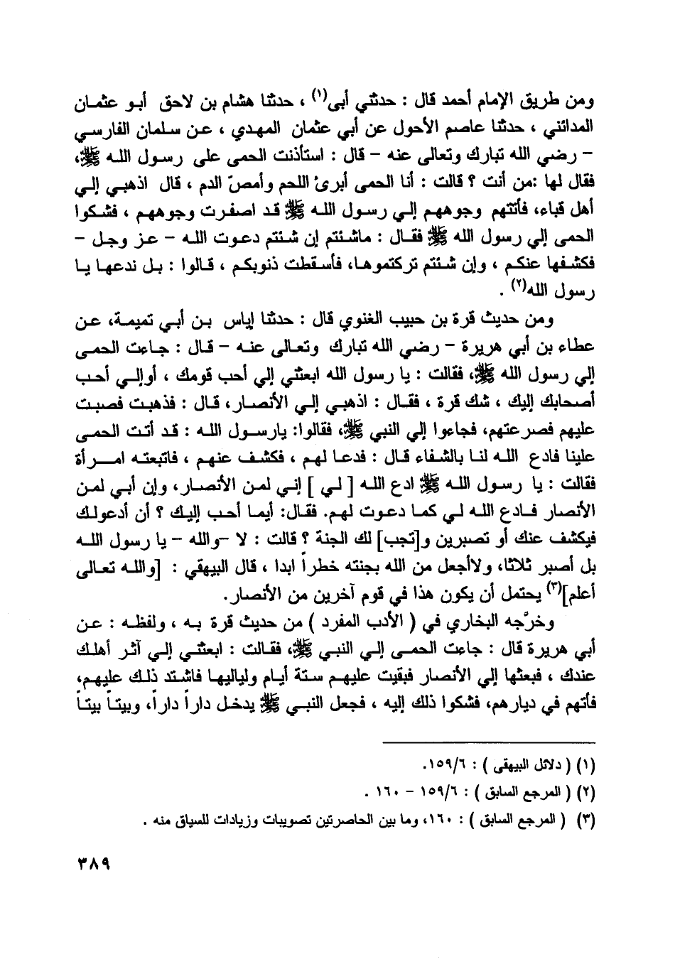 ومن طريق الإمام أحمد قال: حدثني أبى [ (1) ] ، حدثنا هشام بن لاحق أبو عثمان المدائني، حدثنا عاصم الأحول عن أبي عثمان المهدي، عن سلمان الفارسيّ- رضي اللَّه تبارك وتعالى عنه- قال: استأذنت الحمى على رسول اللَّه صلّى اللَّه عليه وسلّم، فقال لها: من أنت؟ قالت: أنا الحمى أبرئ اللحم وأمصّ الدم، قال اذهبي إلي أهل قباء، فأتتهم وجوههم إلى رسول اللَّه صلّى اللَّه عليه وسلّم قد اصفرت وجوههم، فشكوا الحمى إلى رسول اللَّه صلّى اللَّه عليه وسلّم فقال: ما شئتم إن شئتم دعوت اللَّه- عز وجل- فكشفها عنكم، وإن شئتم تركتموها، فأسقطت ذنوبكم، قالوا: بل ندعها يا رسول اللَّه [ (2) ] .