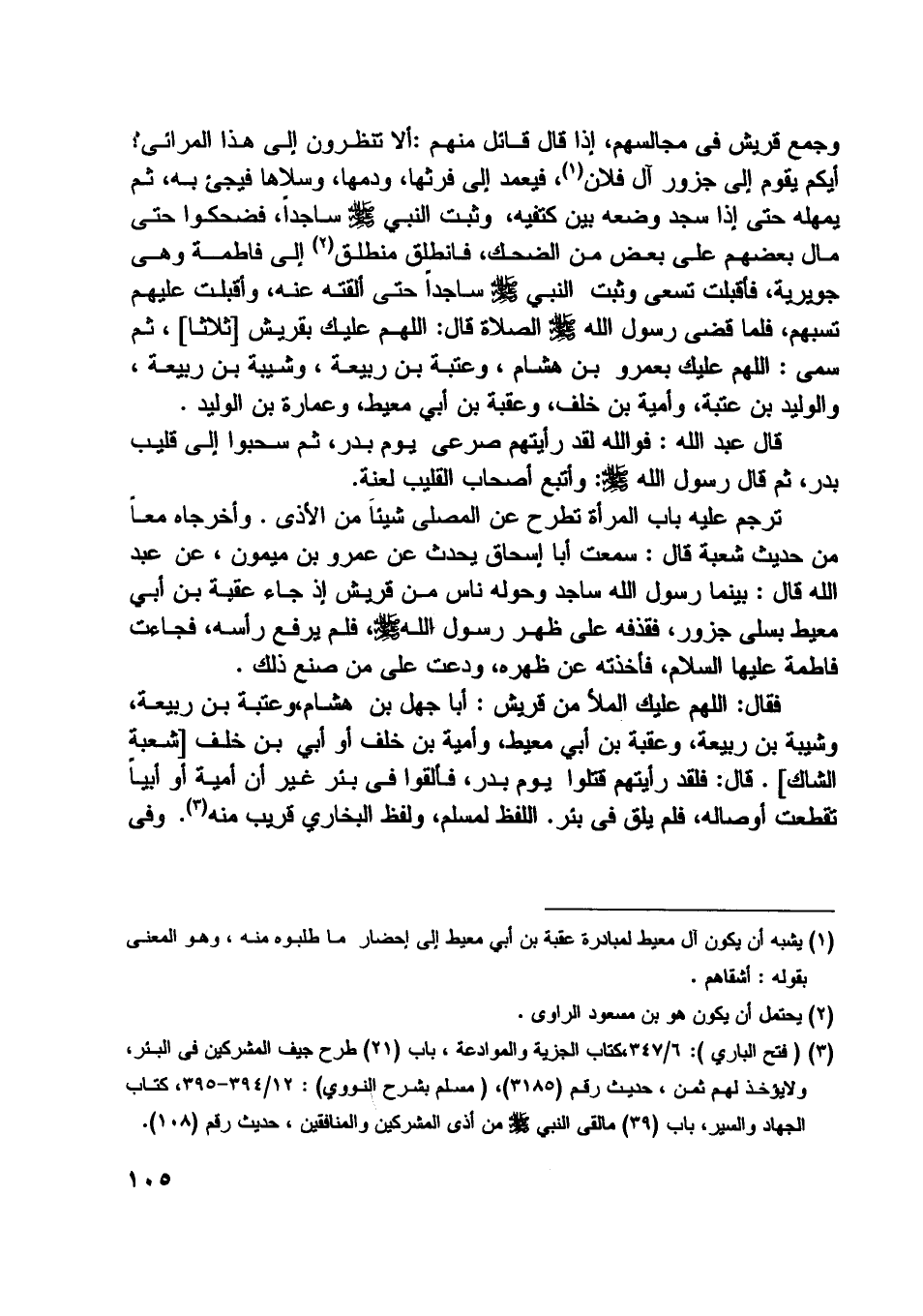 [ (3) ] (فتح الباري) : 6/ 347، كتاب الجزية والموادعة، باب (21) طرح جيف المشركين في البئر، ولا يؤخذ لهم ثمن، حديث رقم (3185) ، (مسلم بشرح النووي) : 12/ 394- 395، كتاب الجهاد والسير، باب (39) ما لقى النبي صلّى اللَّه عليه وسلم من أذى المشركين والمنافقين، حديث رقم (108) .