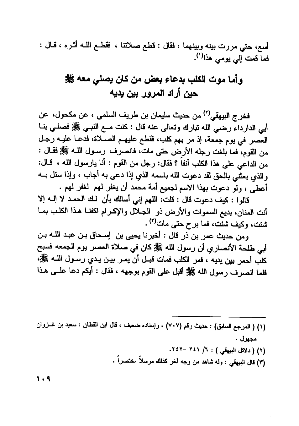 وأما موت الكلب بدعاء بعض من كان يصلي معه صلّى اللَّه عليه وسلم حين أراد المرور بين يديه