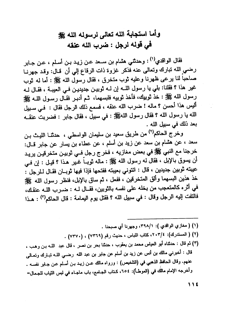 فقال الواقدي [ (1) ] : وحدثني هشام بن سعد عن زيد بن أسلم، عن جابر رضي اللَّه تبارك وتعالى عنه فذكر غزوة ذات الرقاع إلى أن قال: وقد جهرنا صاحبا لنا يرعى ظهرنا وعليه ثوب متخرق، فقال رسول اللَّه صلّى اللَّه عليه وسلم: أما له ثوب غير هذا؟ فقلنا: بلي يا رسول اللَّه إن له ثوبين جديدين في العيبة، فقال له رسول اللَّه صلّى اللَّه عليه وسلم: خذ ثوبيك، فأخذ ثوبيه فلبسهما، ثم أدبر فقال رسول اللَّه صلّى اللَّه عليه وسلم أليس هذا أحسن؟ ما له! ضرب اللَّه عنقه، فسمع ذلك الرجل فقال: في سبيل اللَّه يا رسول اللَّه؟ فقال رسول اللَّه صلّى اللَّه عليه وسلم: في سبيل، فقال جابر: فضربت عنقه بعد ذلك في سبيل اللَّه.