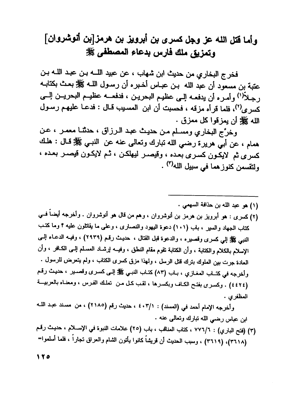 وأخرجه في كتاب المغازي، باب (83) كتاب النبي صلّى اللَّه عليه وسلم إلى كسرى وقصير، حديث رقم (4424) . وكسرى بفتح الكاف وبكسرها، لقب كل من تملك الفرس، ومعناه بالعربية المظفري.