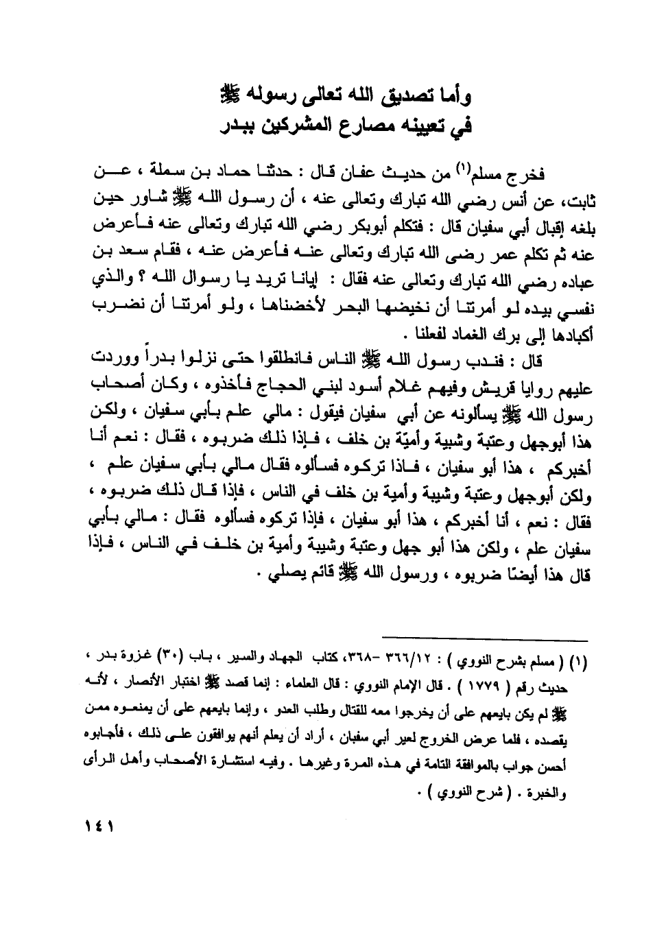[ (1) ] (مسلم بشرح النووي) : 12/ 366- 368، كتاب الجهاد والسير، باب (30) غزوة بدر، حديث رقم (1779) . قال الإمام النووي: قال العلماء: إنما قصد صلّى اللَّه عليه وسلم اختبار الأنصار، لأنه صلّى اللَّه عليه وسلم لم يكن بايعهم على أن يخرجوا معه للقتال وطلب العدو، وإنما بايعهم على أن يمنعوه ممن يقصده، فلما عرض الخروج لعير أبي سفيان، أراد أن يعلم أنهم يوافقون على ذلك، فأجابوه أحسن جواب بالموافقة التامة في هذه المرة وغيرها. وفيه استشارة الأصحاب وأهل الرأى والخبرة. (شرح النووي) .