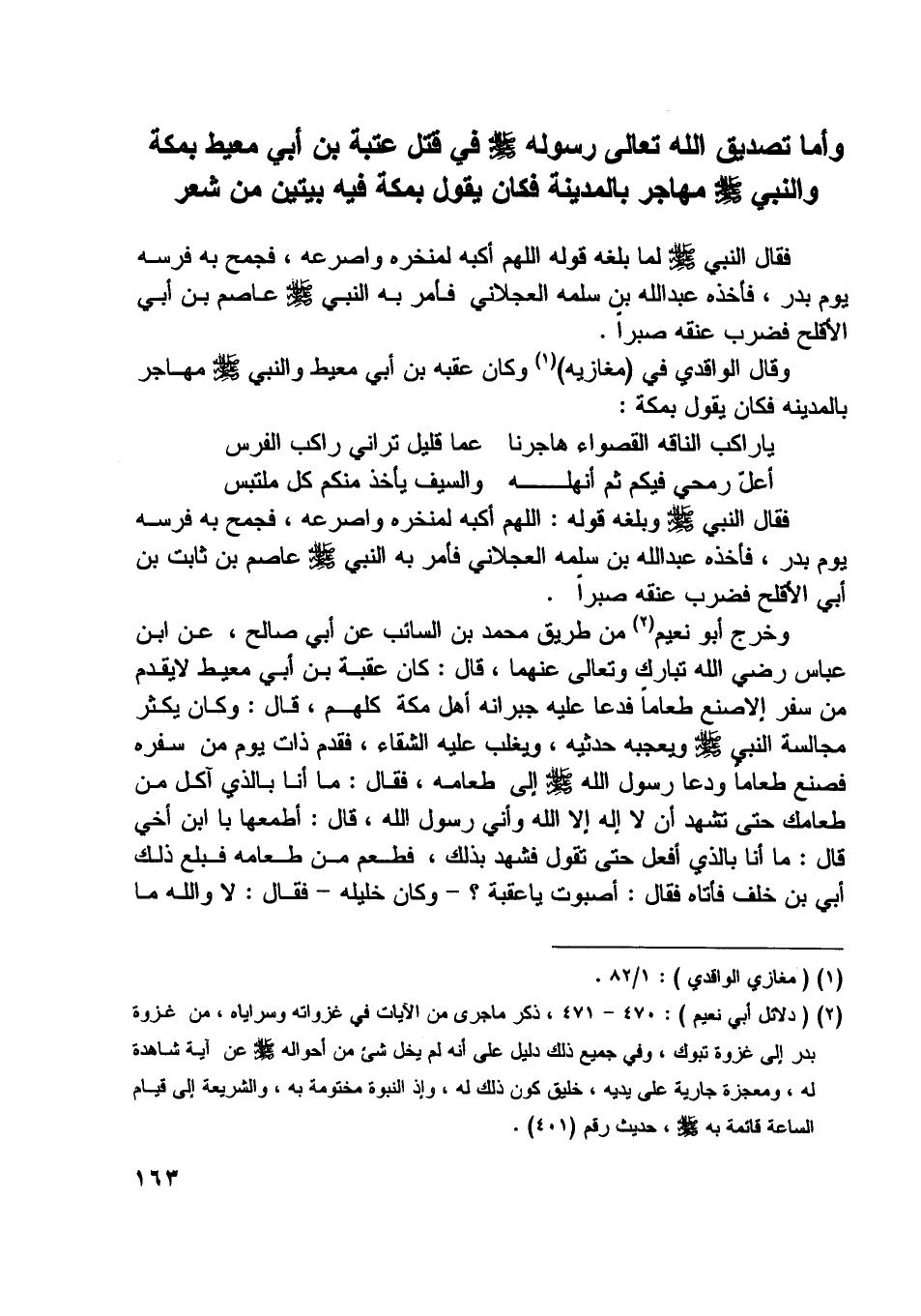 وأما تصديق اللَّه تعالى رسوله صلّى اللَّه عليه وسلم في قتل عتبة بن أبي معيط بمكة والنبي صلّى اللَّه عليه وسلم مهاجر بالمدينة فكان يقول بمكة فيه بيتين من شعر