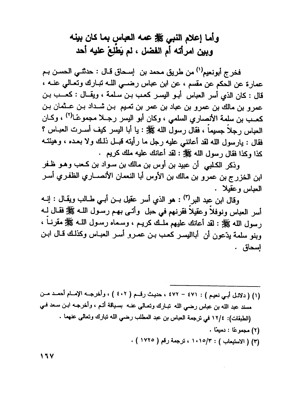 [ (1) ] (دلائل أبي نعيم) : 471- 472، حديث رقم (402) ، وأخرجه الإمام أحمد من مسند عبد اللَّه بن عباس رضي اللَّه تبارك وتعالى عنه بسياقة أتم، وأخرجه ابن سعد في (الطبقات) : 4/ 12 في ترجمة العباس بن عبد المطلب رضي اللَّه تبارك وتعالى عنهما.