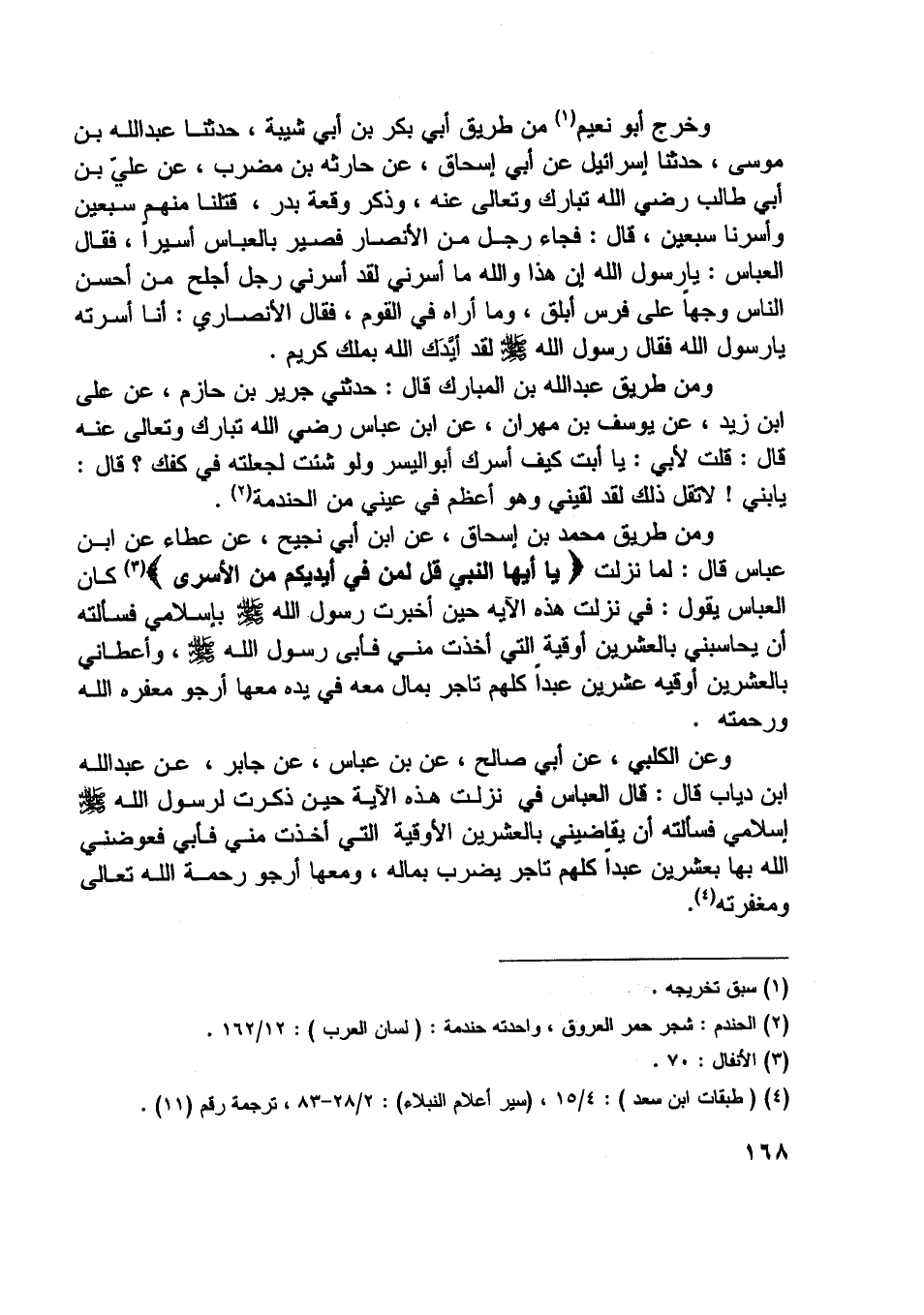ومن طريق محمد بن إسحاق، عن ابن أبي نجيح، عن عطاء عن ابن عباس قال: لما نزلت يا أَيُّهَا النَّبِيُّ قُلْ لِمَنْ فِي أَيْدِيكُمْ مِنَ الْأَسْرى [ (3) ] كان العباس يقول: في نزلت هذه الآية حين أخبرت رسول اللَّه صلّى اللَّه عليه وسلم بإسلامي فسألته أن يحاسبني بالعشرين أوقية التي أخذت مني فأبى رسول اللَّه صلّى اللَّه عليه وسلم، وأعطاني بالعشرين أوقية عشرين عبدا كلهم تاجر بمال معه في يده معها أرجو مغفرة اللَّه ورحمته.