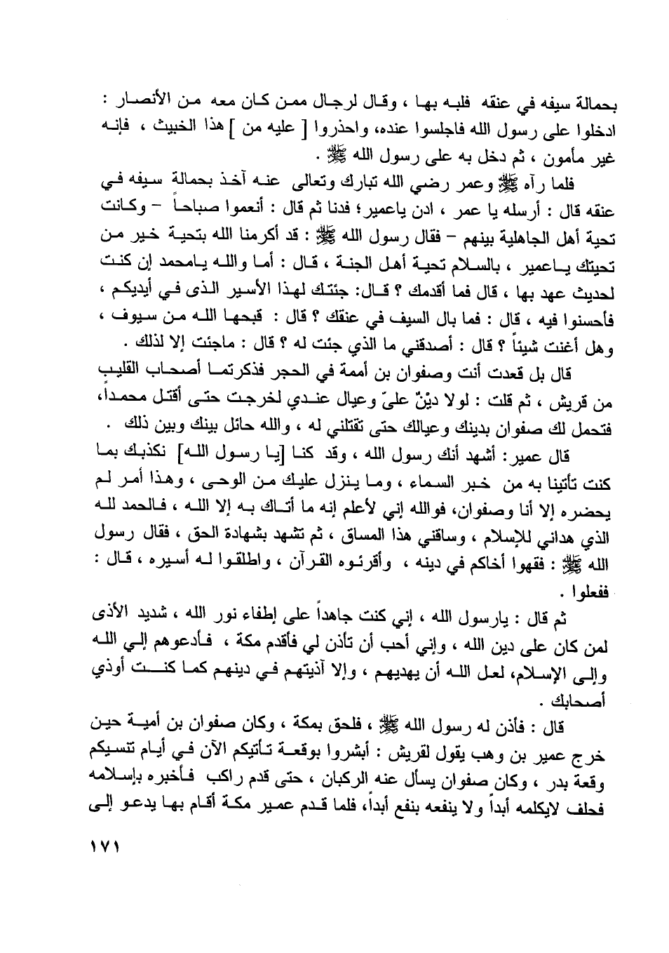 قال عمير: أشهد أنك رسول اللَّه، وقد كنا [يا رسول اللَّه] نكذبك بما كنت تأتينا به من خبر السماء، وما ينزل عليك من الوحي، وهذا أمر لم يحضره إلا أنا وصفوان، فو اللَّه إني لأعلم إنه ما أتاك به إلا اللَّه، فالحمد للَّه الّذي هداني للإسلام، وساقني هذا المساق، ثم تشهد بشهادة الحق، فقال رسول اللَّه صلّى اللَّه عليه وسلم: فقهوا أخاكم في دينه، وأقرئوه القرآن، وأطلقوا له أسيره، قال: