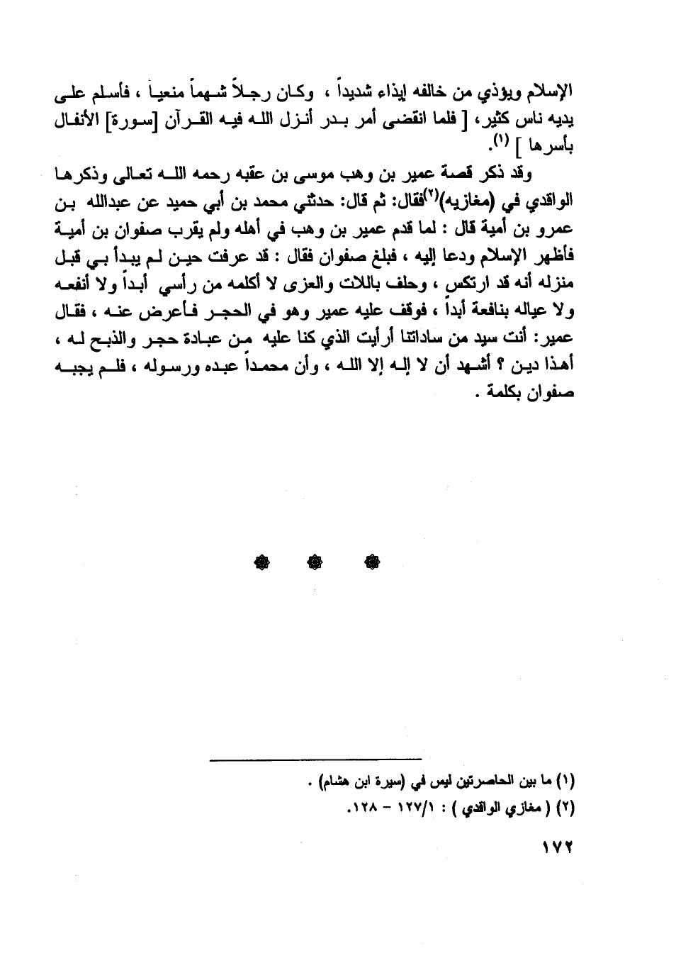 وقد ذكر قصة عمير بن وهب موسى بن عقبه رحمه اللَّه تعالى وذكرها الواقدي في (مغازيه) [ (2) ] فقال: ثم قال: حدثني محمد بن أبي حميد عن عبد اللَّه بن عمرو بن أمية قال: لما قدم عمير بن وهب في أهله ولم يقرب صفوان بن أمية فأظهر الإسلام ودعا إليه، فبلغ صفوان فقال: قد عرفت حين لم يبدأ بي قبل منزله أنه قد ارتكس، وحلف باللات والعزى لا أكلمه من رأسي أبدا ولا أنفعه ولا عياله بنافعة أبدا، فوقف عليه عمير وهو في الحجر فأعرض عنه، فقال عمير: أنت سيد من ساداتنا أرأيت الّذي كنا عليه من عبادة حجر والذبح له، أهذا دين؟ أشهد أن لا إله إلا اللَّه، وأن محمدا عبده ورسوله، فلم يجبه صفوان بكلمة.