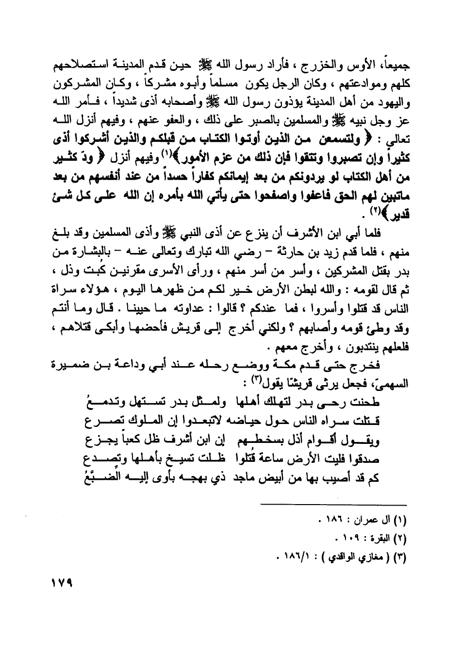 جميعا، الأوس والخزرج، فأراد رسول اللَّه صلّى اللَّه عليه وسلم حين قدم المدينة استصلاحهم كلهم وموادعتهم، وكان الرجل يكون مسلما وأبوه مشركا، وكان المشركون واليهود من أهل المدينة يؤذون رسول اللَّه صلّى اللَّه عليه وسلم وأصحابه أذى شديدا، فأمر اللَّه عز وجل نبيه صلّى اللَّه عليه وسلم والمسلمين بالصبر على ذلك، والعفو عنهم، وفيهم أنزل اللَّه تعالى: وَلَتَسْمَعُنَّ مِنَ الَّذِينَ أُوتُوا الْكِتابَ مِنْ قَبْلِكُمْ وَمِنَ الَّذِينَ أَشْرَكُوا أَذىً كَثِيراً وَإِنْ تَصْبِرُوا وَتَتَّقُوا فَإِنَّ ذلِكَ مِنْ عَزْمِ الْأُمُورِ [ (1) ] وفيهم أنزل وَدَّ كَثِيرٌ مِنْ أَهْلِ الْكِتابِ لَوْ يَرُدُّونَكُمْ مِنْ بَعْدِ إِيمانِكُمْ كُفَّاراً حَسَداً مِنْ عِنْدِ أَنْفُسِهِمْ مِنْ بَعْدِ ما تَبَيَّنَ لَهُمُ الْحَقُّ فَاعْفُوا وَاصْفَحُوا حَتَّى يَأْتِيَ اللَّهُ بِأَمْرِهِ إِنَّ اللَّهَ عَلى كُلِّ شَيْءٍ قَدِيرٌ [ (2) ] .