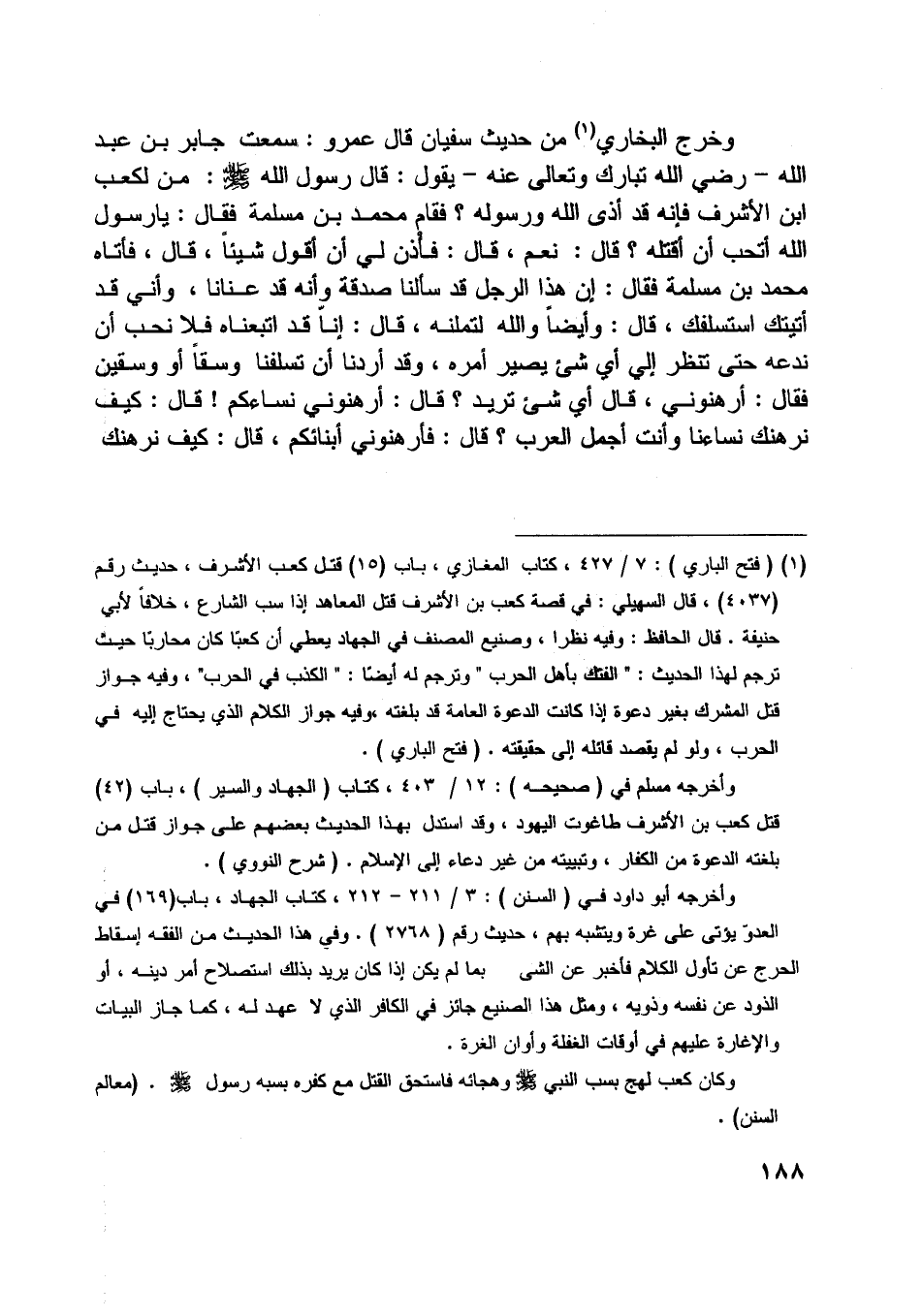 [ (1) ] (فتح الباري) : 7/ 427، كتاب المغازي، باب (15) قتل كعب الأشرف، حديث رقم (4037) ، قال السهيليّ: في قصة كعب بن الأشرف قتل المعاهد إذا سب الشارع، خلافا لأبي حنيفة. قال الحافظ: وفيه نظرا، وصنيع المصنف في الجهاد يعطي أن كعبا كان محاربا حيث ترجم لهذا الحديث: «الفتك بأهل الحرب» وترجم له أيضا: «الكذب في الحرب» ، وفيه جواز قتل المشرك بغير دعوة إذا كانت الدعوة العامة قد بلغته، وفيه جواز الكلام الّذي يحتاج إليه في الحرب، ولو لم يقصد قائله إلى حقيقته. (فتح الباري) .