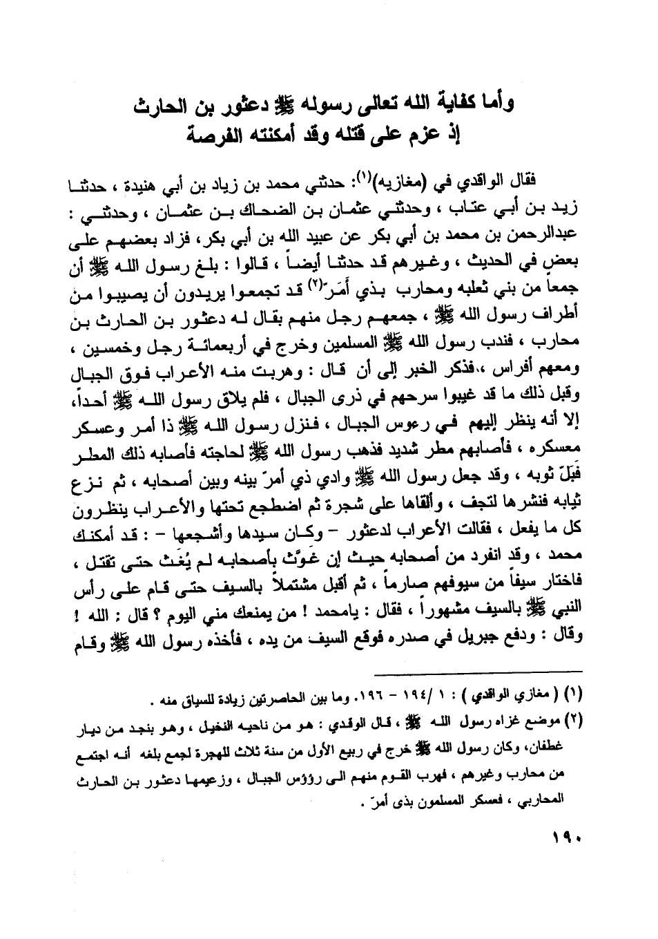 وأما كفاية اللَّه تعالى رسوله صلّى اللَّه عليه وسلم دعثور بن الحارث إذ عزم على قتله وقد أمكنته الفرصة