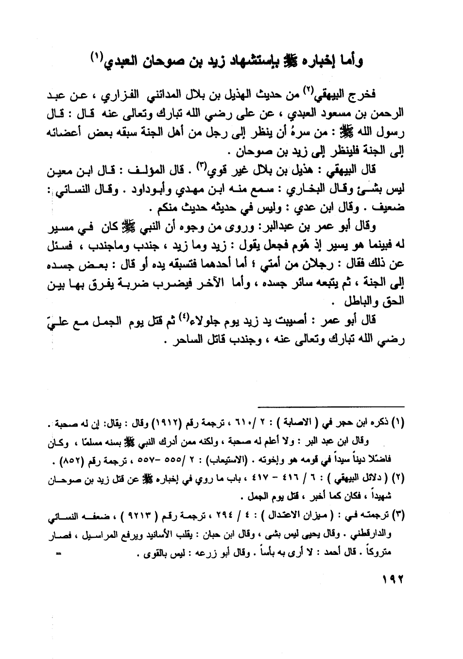 [ (2) ] (دلائل البيهقي) : 6/ 416- 417، باب ما روي في إخباره صلّى اللَّه عليه وسلم عن قتل زيد بن صوحان شهيدا، فكان كما أخبر، قتل يوم الجمل.