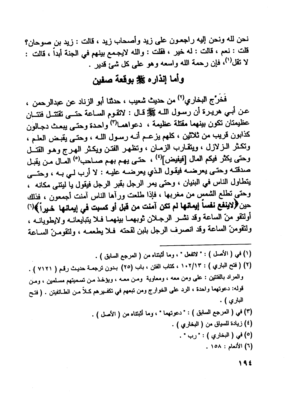 فخرّج البخاري [ (2) ] من حديث شعيب، حدثنا أبو الزناد عن عبد الرحمن، عن أبي هريرة أن رسول اللَّه صلّى اللَّه عليه وسلم قال: لا تقوم الساعة حتى تقتتل فئتان عظيمتان تكون بينهما مقتلة عظيمة، دعواهما [ (3) ] واحدة وحتى يبعث دجالون كذابون قريب من ثلاثين، كلهم يزعم أنه رسول اللَّه، وحتى يقبض العلم، وتكثر الزلازل، ويتقارب الزمان، وتظهر الفتن ويكثر الهرج وهو القتل وحتى يكثر فيكم المال [فيفيض] [ (4) ] ، حتى يهم بهم صاحب [ (5) ] المال من يقبل صدقته وحتى يعرضه فيقول الّذي يعرضه عليه: لا أرب لي به، وحتى يتطاول الناس في البنيان، وحتى يمر الرجل بقبر الرجل فيقول يا ليتني مكانه، وحتى تطلع الشمس من مغربها، فإذا طلعت ورآها الناس آمنت أجمعون، فذلك حين لا يَنْفَعُ نَفْساً إِيمانُها لَمْ تَكُنْ آمَنَتْ مِنْ قَبْلُ أَوْ كَسَبَتْ فِي إِيمانِها خَيْراً [ (6) ] أو لتقومنّ الساعة وقد نشر الرجلان ثوبهما بينهما فلا يتبايعانه ولا يطويانه، ولتقومنّ الساعة وقد انصرف الرجل بلبن لقحته فلا يطعمه، ولتقومنّ الساعة