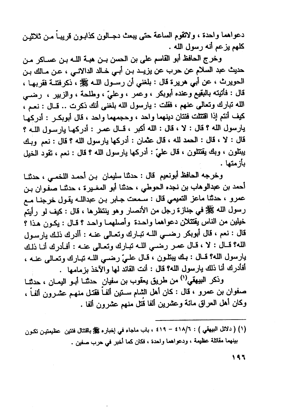 [ (1) ] (دلائل البيهقي) : 6/ 418- 419، باب ما جاء في إخباره صلّى اللَّه عليه وسلم باقتتال فئتين عظيمتين تكون بينهما مقاتلة عظيمة، ودعواهما واحدة، فكان كما أخبر في حرب صفين.
