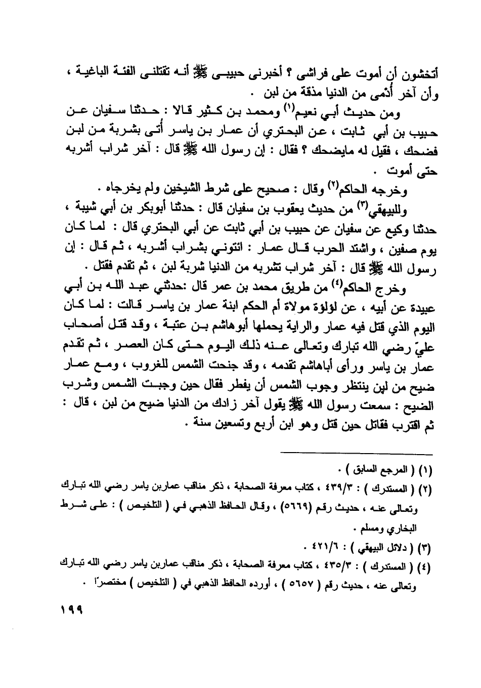 [ (4) ] (المستدرك) : 3/ 435، كتاب معرفة الصحابة، ذكر مناقب عمار بن ياسر رضي اللَّه تبارك وتعالى عنه، حديث رقم (5657) ، أورده الحافظ الذهبي في (التلخيص) مختصرا.