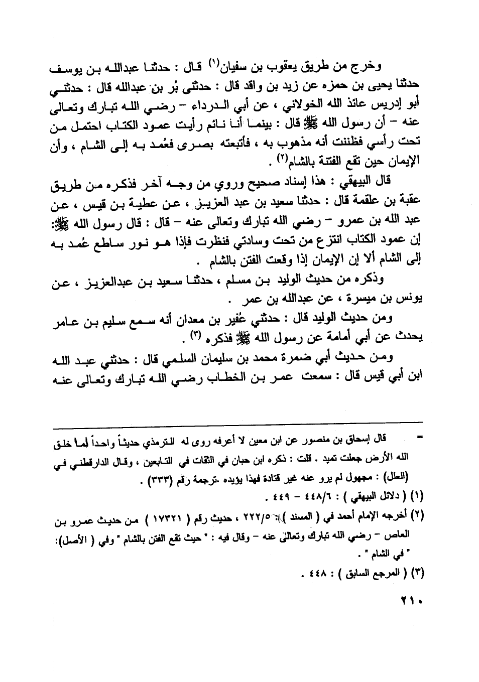 قال البيهقي: هذا إسناد صحيح وروي من وجه آخر فذكره من طريق عقبة بن علقمة قال: حدثنا سعيد بن عبد العزيز، عن عطية بن قيس، عن عبد اللَّه بن عمرو- رضي اللَّه تبارك وتعالى عنه- قال: قال رسول اللَّه صلّى اللَّه عليه وسلم: إن عمود الكتاب انتزع من تحت وسادتي فنظرت فإذا هو نور ساطع عمد به إلى الشام ألا إن الإيمان إذا وقعت الفتن بالشام.