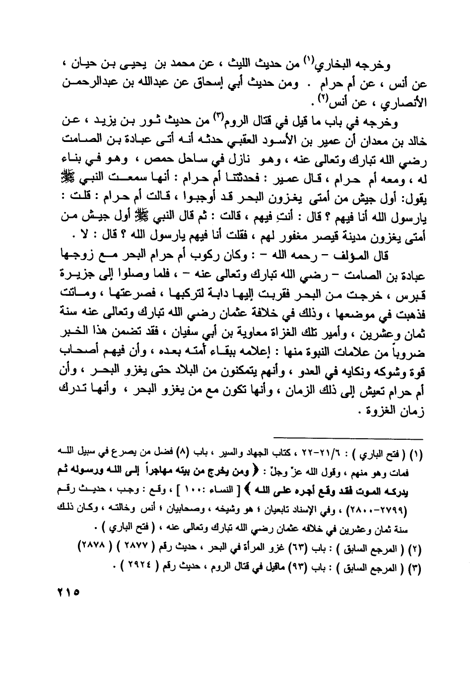 [ (2) ] (المرجع السابق) : باب (63) غزو المرأة في البحر، حديث رقم (2877) (2878)