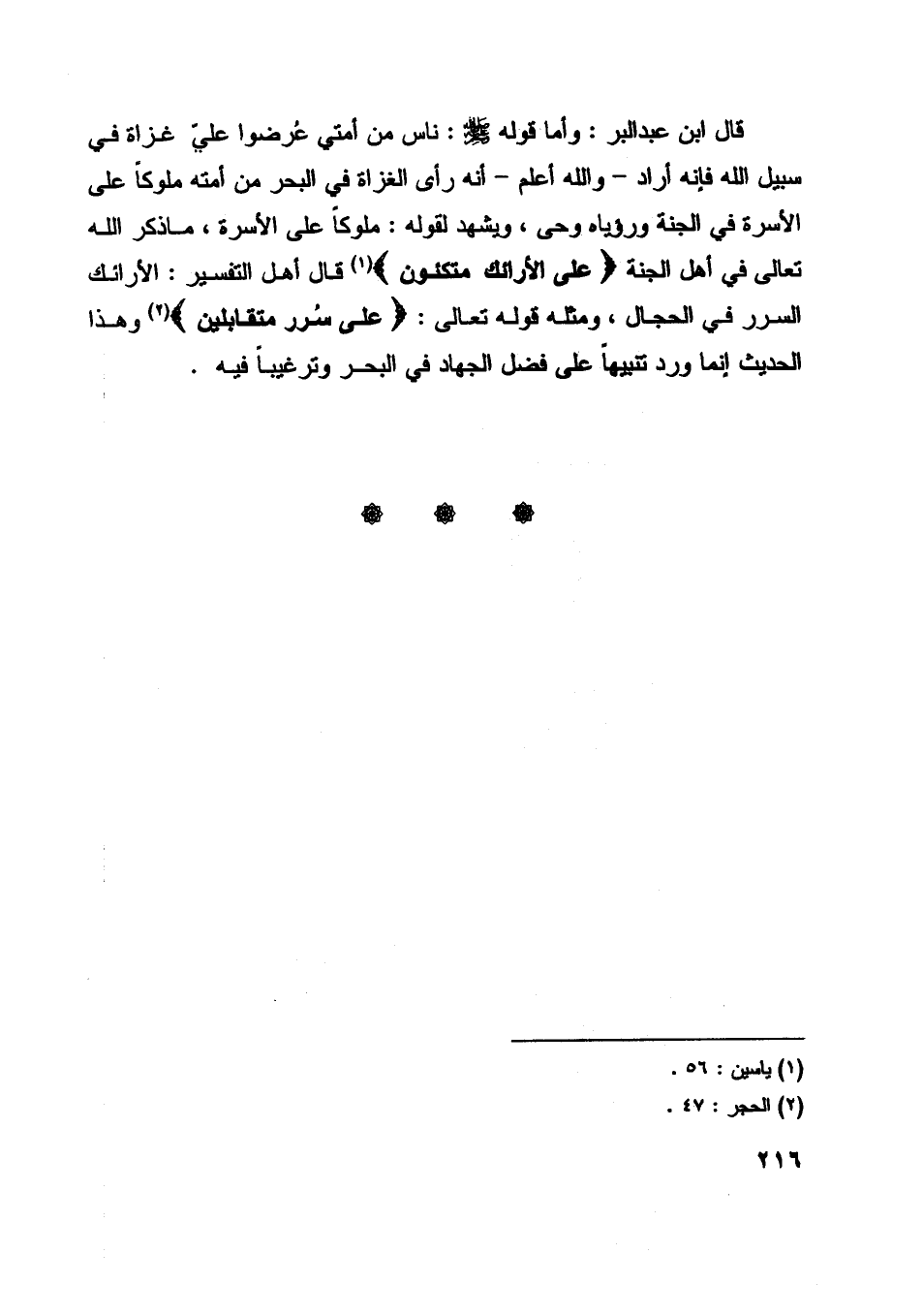 ما ذكر اللَّه تعالى في أهل الجنة عَلَى الْأَرائِكِ مُتَّكِؤُنَ [ (1) ] قال أهل التفسير: الأرائك السرر في الحجال، ومثله قوله تعالى: عَلى سُرُرٍ مُتَقابِلِينَ [ (2) ] وهذا الحديث إنما ورد تنبيها على فضل الجهاد في البحر وترغيبا فيه.