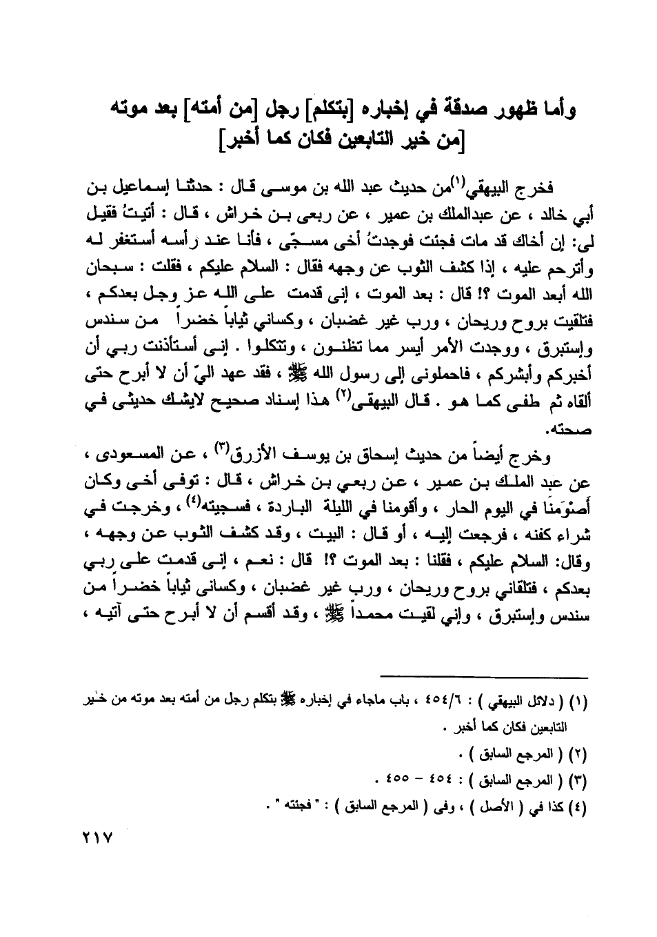 فخرج البيهقي [ (1) ] من حديث عبد اللَّه بن موسى قال: حدثنا إسماعيل بن أبي خالد، عن عبد الملك بن عمير، عن ربعي بن خراش، قال: أتيت فقيل لي: إن أخاك قد مات فجئت فوجدت أخى مسجّى، فأنا عند رأسه أستغفر له وأترحم عليه، إذا كشف الثوب عن وجهه فقال: السلام عليكم، فقلت: سبحان اللَّه أبعد الموت؟! قال: بعد الموت، إني قدمت على اللَّه عز وجل بعدكم، فتلقيت بروح وريحان، ورب غير غضبان، وكساني ثيابا خضرا من سندس وإستبرق، ووجدت الأمر أيسر مما تظنون، وتتكلوا. إني استأذنت ربي أن أخبركم وأبشركم، فاحملوني إلى رسول اللَّه صلّى اللَّه عليه وسلم، فقد عهد اليّ أن لا أبرح حتى ألقاه ثم طفى كما هو. قال البيهقي [ (2) ] هذا إسناد صحيح لا يشك حديثي في صحته.