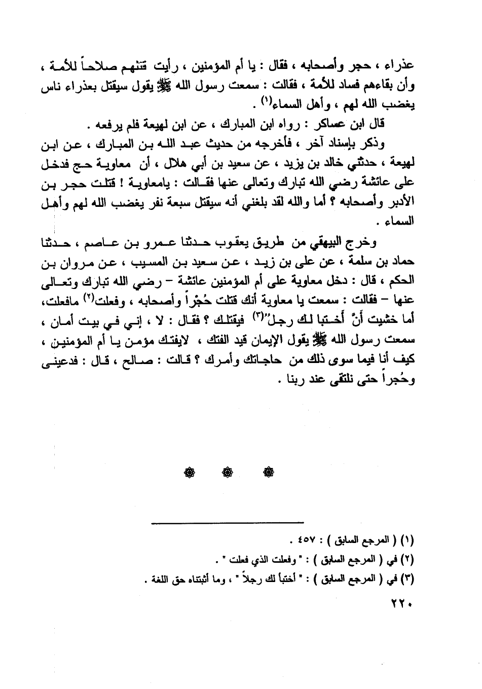 عذراء، حجر وأصحابه، فقال: يا أم المؤمنين، رأيت قتلهم صلاحا للأمة، وأن بقاءهم فساد للأمة،
