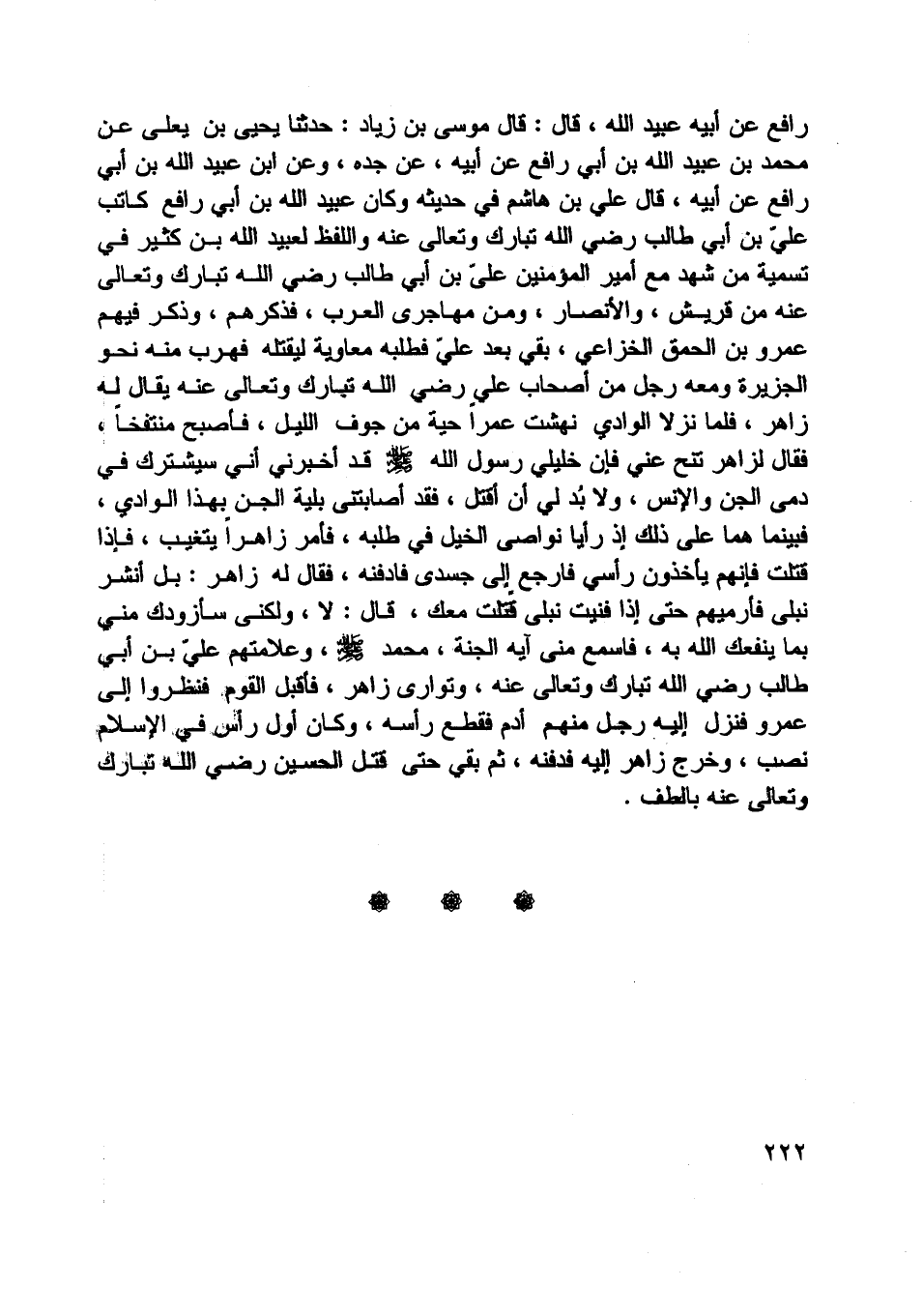 رافع عن أبيه عبيد اللَّه، قال: قال موسى بن زياد: حدثنا يحيى بن يعلى عن محمد بن عبيد اللَّه بن أبي رافع عن أبيه، عن جده، وعن ابن عبيد اللَّه بن أبي رافع عن أبيه، قال علي بن هاشم في حديثه وكان عبيد اللَّه بن أبي رافع كاتب عليّ بن أبي طالب رضي اللَّه تبارك وتعالى عنه واللفظ لعبيد اللَّه بن كثير في تسمية من شهد مع أمير المؤمنين عليّ بن أبي طالب رضي اللَّه تبارك وتعالى عنه من قريش، والأنصار، ومن مهاجري العرب، فذكرهم، وذكر فيهم عمرو بن الحمق الخزاعي، بقي بعد عليّ فطلبه معاوية ليقتله فهرب منه نحو الجزيرة ومعه رجل من أصحاب علي رضي اللَّه تبارك وتعالى عنه يقال له زاهر، فلما نزلا الوادي نهشت عمرا حية من جوف الليل، فأصبح منتفخا، فقال لزاهر تنح عني فإن خليلي رسول اللَّه صلّى اللَّه عليه وسلم قد أخبرني أني سيشترك في دمي الجن والإنس، ولا بد لي أن أقتل، فقد أصابتنى بلية الجن بهذا الوادي، فبينما هما على ذلك إذ رأيا نواصي الخيل في طلبه، فأمر زاهرا يتغيب، فإذا قتلت فإنّهم يأخذون رأسي فارجع إلى جسدي فادفنه، فقال له زاهر: بل أنشر نبلى فأرميهم حتى إذا فنيت نبلى قتلت معك، قال: لا، ولكنى سأزودك مني بما ينفعك اللَّه به، فاسمع منى آيه الجنة، محمد صلّى اللَّه عليه وسلم، وعلامتهم عليّ بن أبي طالب رضي اللَّه تبارك وتعالى عنه، وتوارى زاهر، فأقبل القوم فنظروا إلى عمرو فنزل إليه رجل منهم أدم فقطع رأسه، وكان أول رأس في الإسلام نصب، وخرج زاهر إليه فدفنه، ثم بقي حتى قتل الحسين رضي اللَّه تبارك وتعالى عنه بالطف.