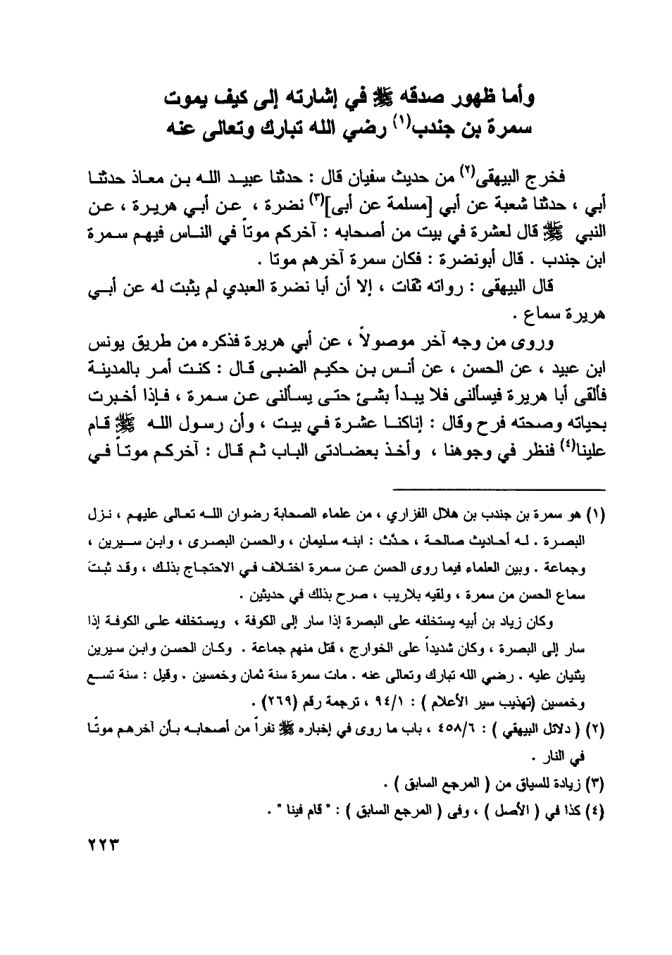 [ (1) ] هو سمرة بن جندب بن هلال الفزاري، من علماء الصحابة رضوان اللَّه تعالى عليهم، نزل البصرة. له أحاديث صالحة، حدّث: ابنه سليمان، والحسن البصري، وابن سيرين، وجماعة. وبين العلماء فيما روى الحسن عن سمرة اختلاف في الاحتجاج بذلك، وقد ثبت سماع الحسن من سمرة، ولقيه بلا ريب، صرح بذلك في حديثين.