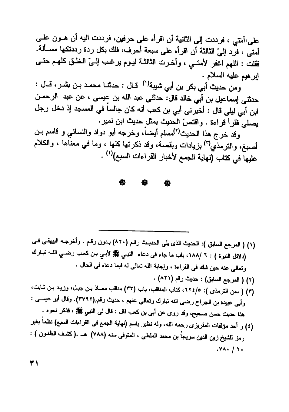 على أمتي، فرددت إلى الثانية أن اقرأه على حرفين، فرددت اليه أن هون على أمتى، فرد إليّ الثالثة أن اقرأه على سبعة أحرف، فلك بكل ردة رددتكها مسألة.