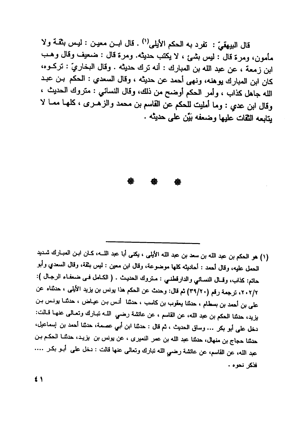 [ (1) ] هو الحكم بن عبد اللَّه بن سعد بن عبد اللَّه الأيلي، يكنى أبا عبد اللَّه، كان ابن المبارك شديد الحمل عليه، وقال أحمد: أحاديثه كلها موضوعة، وقال ابن معين: ليس بثقة، وقال السعدي وأبو حاتم: كذاب، وقال النسائي والدار الدّارقطنيّ: متروك الحديث. (الكامل في ضعفاء الرجال) :