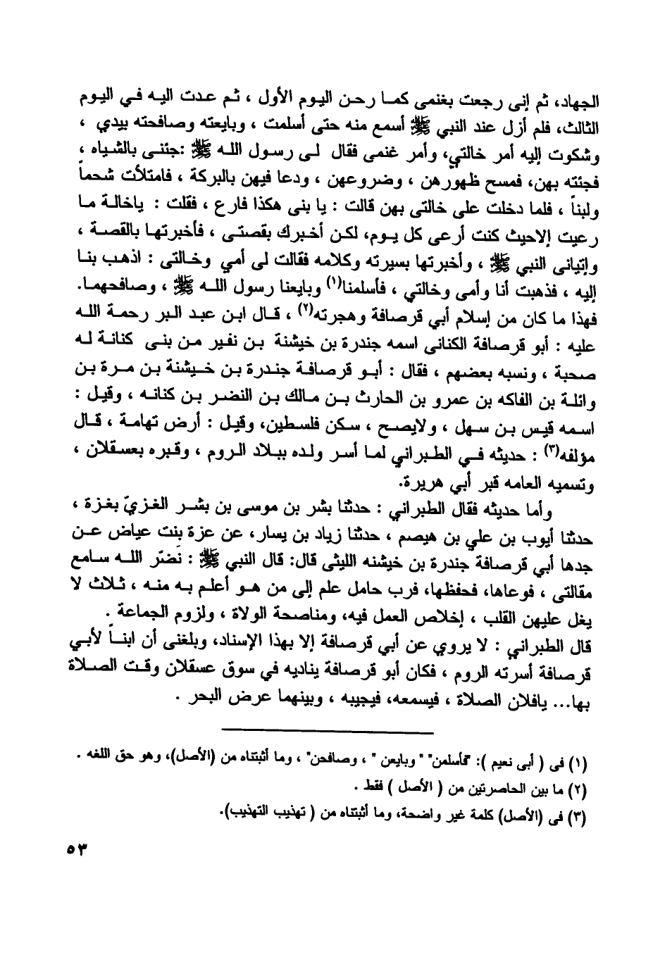فقال الطبراني: حدثنا بشر بن موسى بن بشر الغزيّ بغزة، حدثنا أيوب بن علي بن هيصم، حدثنا زياد بن يسار، عن عزة بنت عياض عن جدها أبي قرصافة جندرة بن خيشنه الليثي قال: قال النبي صلّى اللَّه عليه وسلم: نضر اللَّه سامع مقالتي، فوعاها، فحفظها، فرب حامل علم إلى من هو أعلم به منه، ثلاث لا يغل عليهنّ القلب، إخلاص العمل فيه، ومناصحة الولاة، ولزوم الجماعة.