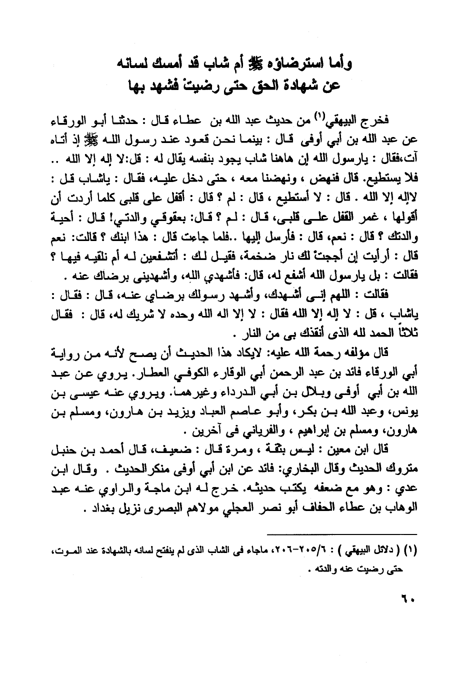 [ (1) ] (دلائل البيهقي) : 6/ 205- 206، ما جاء في الشاب الّذي لم ينفتح لسانه بالشهادة عند الموت، حتى رضيت عنه والدته.