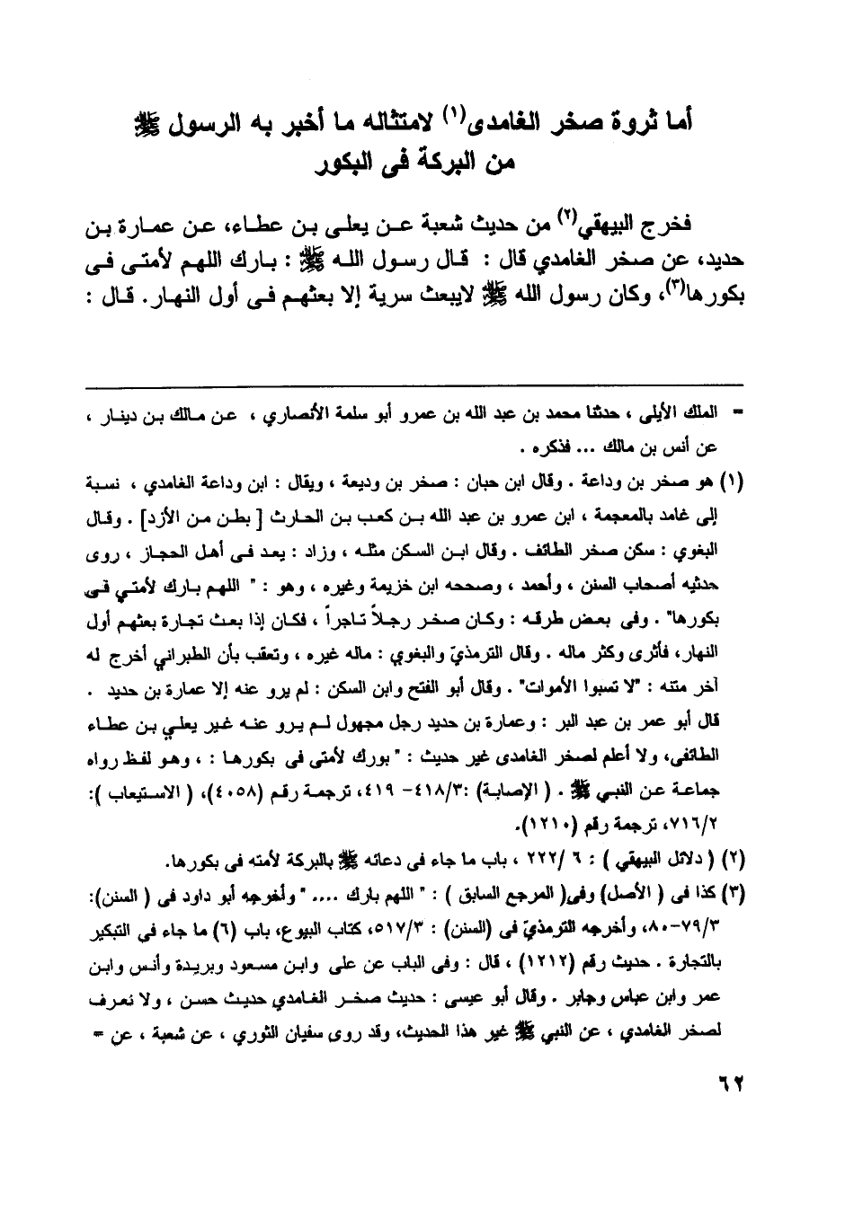 فخرج البيهقي [ (2) ] من حديث شعبة عن يعلى بن عطاء، عن عمارة بن حديد، عن صخر الغامدي قال: قال رسول اللَّه صلّى اللَّه عليه وسلم: بارك اللَّهمّ لأمتى في بكورها [ (3) ] ،