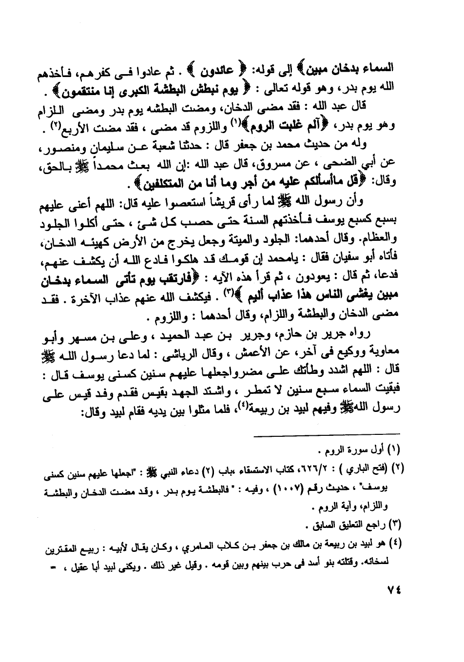 قال عبد اللَّه: فقد مضى الدخان، ومضت البطشة يوم بدر ومضى اللزام وهو يوم بدر، الم غُلِبَتِ الرُّومُ [ (1) ] واللزوم قد مضى، فقد مضت الأربع [ (2) ] .