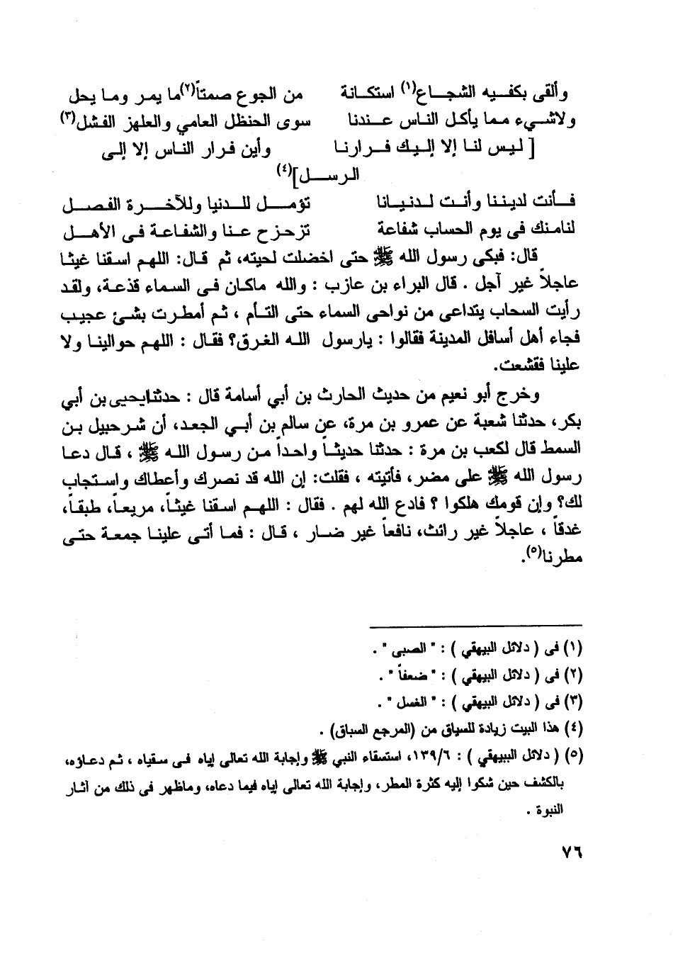 [ (5) ] (دلائل البيهقي) : 6/ 139، استسقاء النبي صلّى اللَّه عليه وسلم وإجابة اللَّه تعالى إياه في سقياه، ثم دعاؤه، بالكشف حين شكوا إليه كثرة المطر، وإجابة اللَّه تعالى إياه فيما دعاه، وما ظهر في ذلك من آثار النبوة.