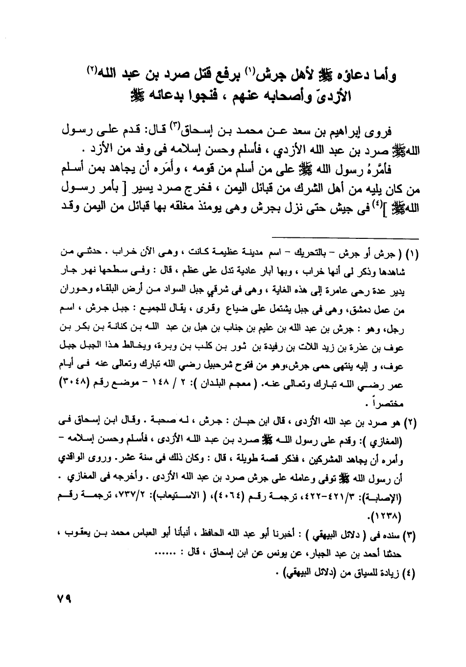 وأما دعاؤه صلّى اللَّه عليه وسلم لأهل جرش [ (1) ] برفع قتل صرد بن عبد اللَّه [ (2) ] الأزديّ وأصحابه عنهم، فنجوا بدعائه صلّى اللَّه عليه وسلم