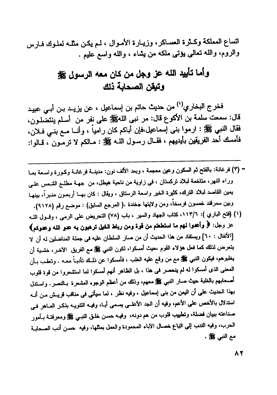 فخرج البخاري [ (1) ] من حديث حاتم بن إسماعيل، عن يزيد بن أبي عبيد قال: سمعت سلمة بن الأكوع قال: مر نبي اللَّه صلّى اللَّه عليه وسلم على نفر من أسلم ينتضلون، فقال النبي صلّى اللَّه عليه وسلم: ارموا بنى إسماعيل، فإن أباكم كان راميا، وأنا مع بني فلان، فأمسك أحد الفريقين بأيديهم، فقال رسول اللَّه صلّى اللَّه عليه وسلم: ما لكم لا ترمون، قالوا: