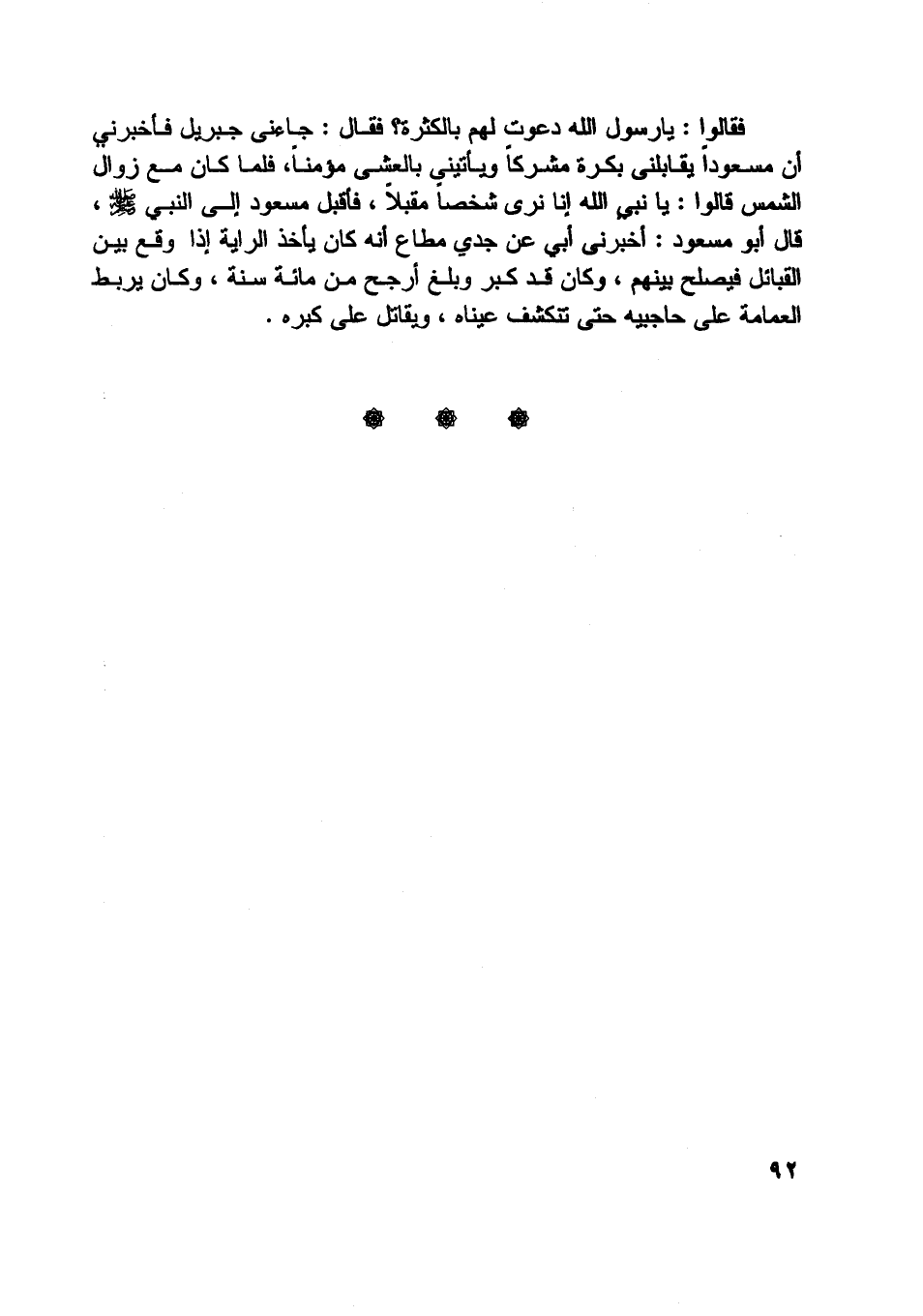 فقالوا: يا رسول اللَّه دعوت لهم بالكثرة؟ فقال: جاءني جبريل فأخبرني أن مسعودا يقابلني بكرة مشركا ويأتيني بالعشي مؤمنا، فلما كان مع زوال الشمس قالوا: يا نبي اللَّه إنا نرى شخصا مقبلا، فأقبل مسعود إلى النبي صلّى اللَّه عليه وسلم،