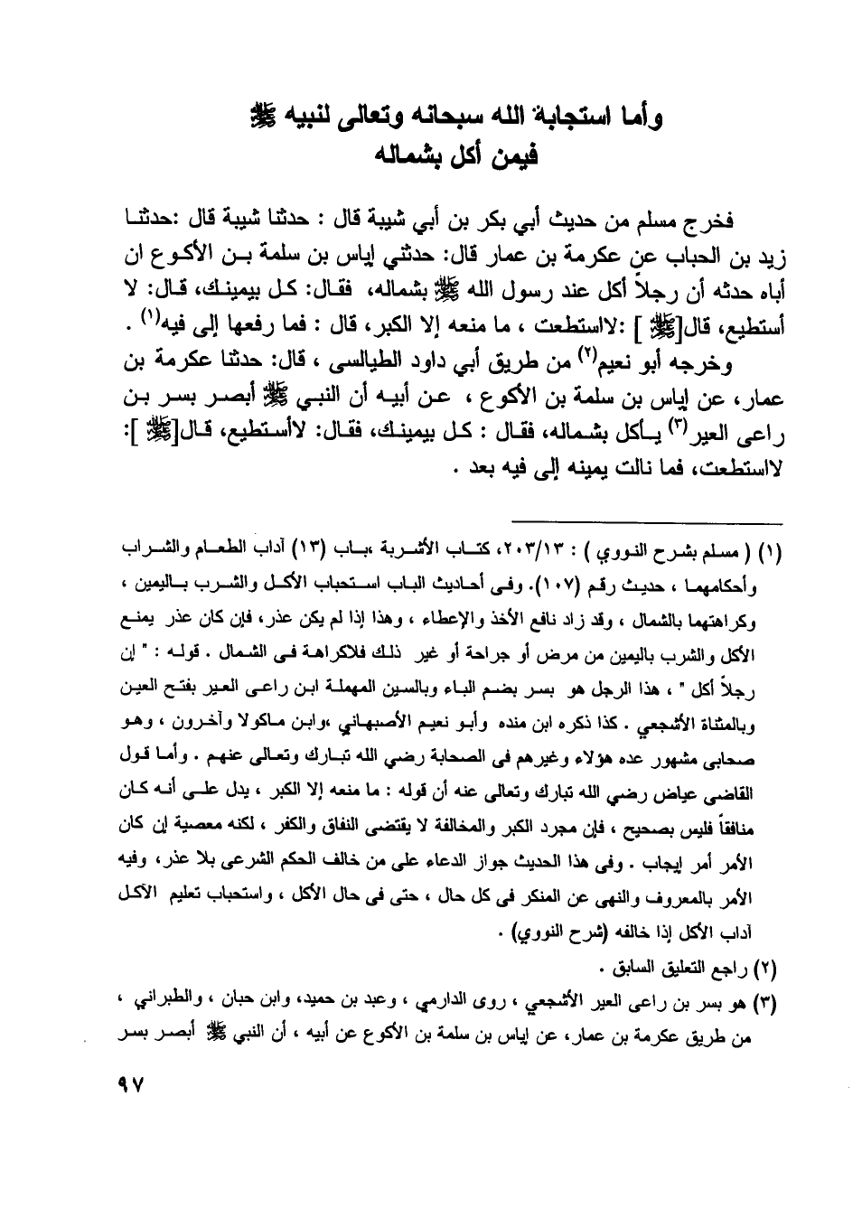 فخرج مسلم من حديث أبي بكر بن أبي شيبة قال: حدثنا شيبة قال: حدثنا زيد بن الحباب عن عكرمة بن عمار قال: حدثني إياس بن سلمة بن الأكوع ان أباه حدثه أن رجلا أكل عند رسول اللَّه صلّى اللَّه عليه وسلم بشماله، فقال: كل بيمينك، قال: لا أستطيع، قال [صلّى اللَّه عليه وسلم] : لا استطعت، ما منعه إلا الكبر، قال: فما رفعها إلى فيه [ (1) ] .