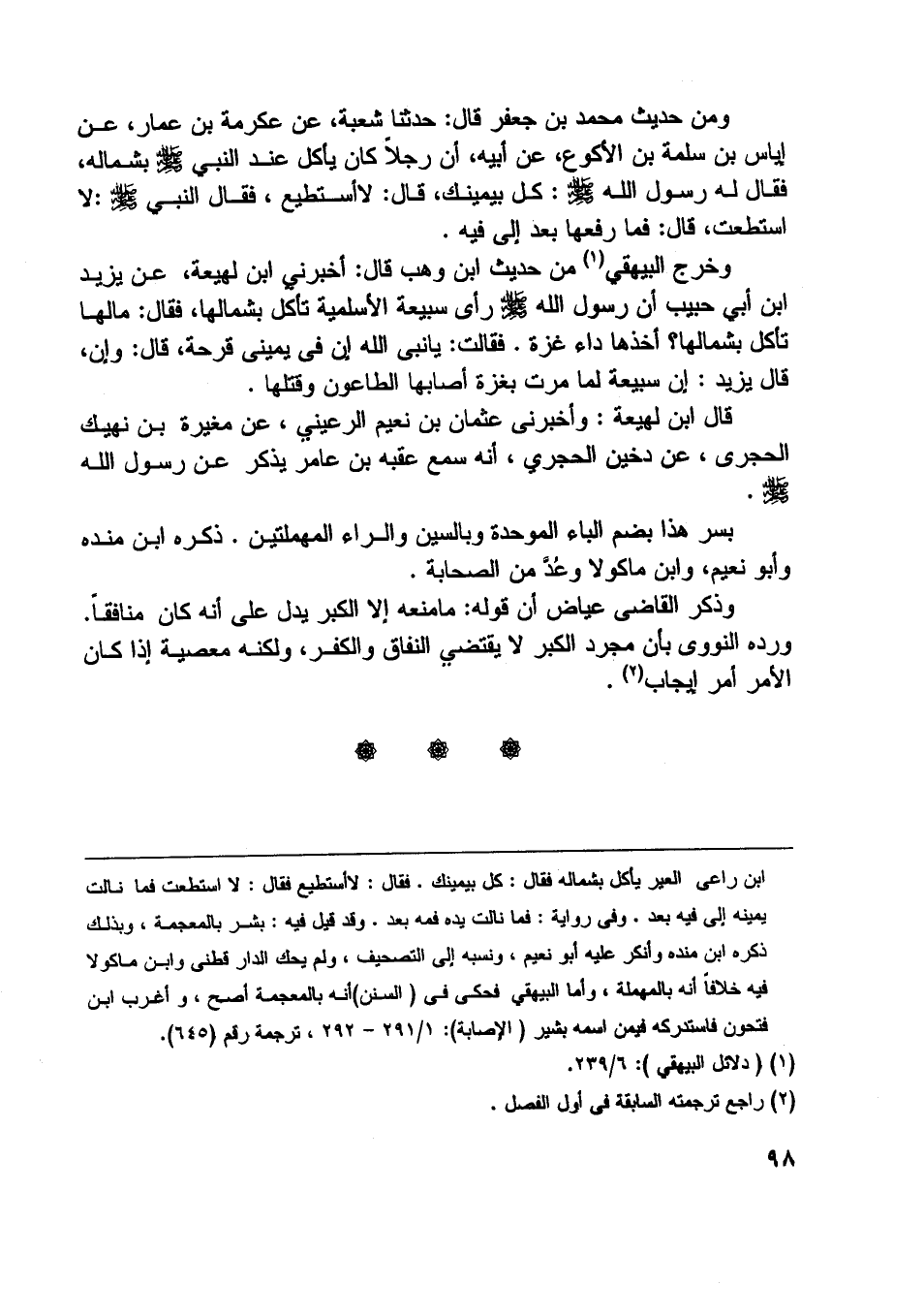 [ () ] ابن راعى العير يأكل بشماله فقال: كل بيمينك. فقال: لا أستطيع فقال: لا استطعت فما نالت يمينه إلى فيه بعد.