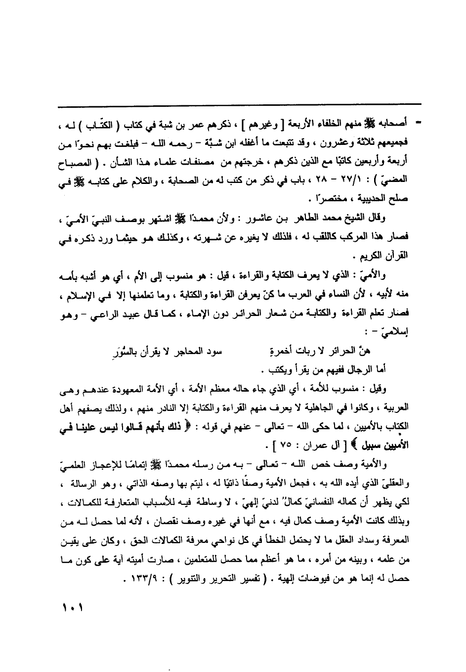 وقال الشيخ محمد الطاهر بن عاشور: ولأن محمدا صلّى اللَّه عليه وسلّم اشتهر بوصف النبي الأميّ، فصار هذا المركب كاللقب له، فلذلك لا يغيره عن شهرته، وكذلك هو حيثما ورد ذكره في القرآن الكريم.