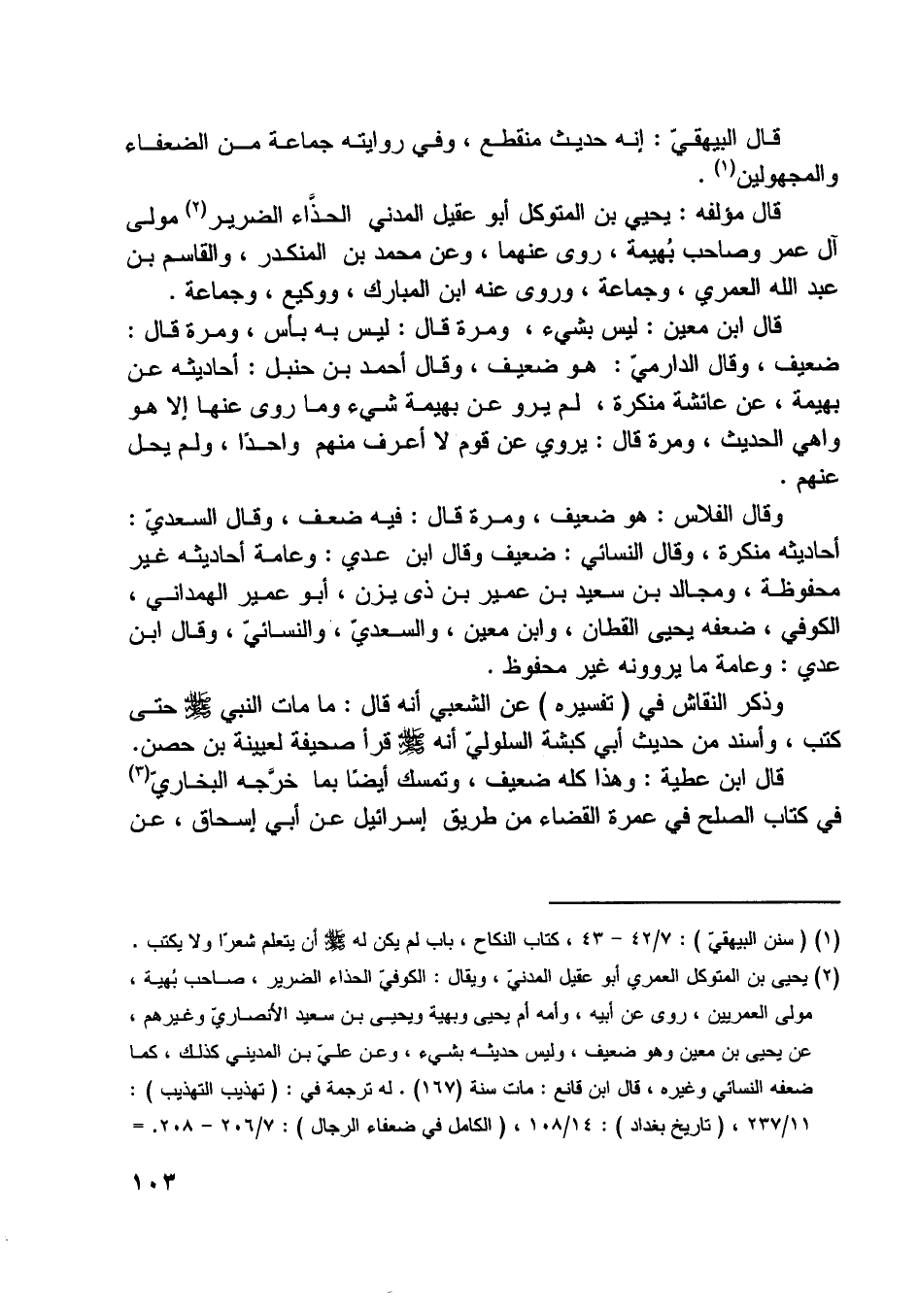 [ (2) ] يحيى بن المتوكل العمري أبو عقيل المدنيّ، ويقال: الكوفيّ الحذاء الضرير، صاحب بهية، مولى العمريين، روى عن أبيه، وأمه أم يحيى وبهية ويحيى بن سعيد الأنصاريّ وغيرهم، عن يحيى بن معين وهو ضعيف، وليس حديثه بشيء، وعن عليّ بن المديني كذلك، كما ضعفه النسائي وغيره، قال ابن قانع: مات سنة (167) . له ترجمة في: (تهذيب التهذيب) :