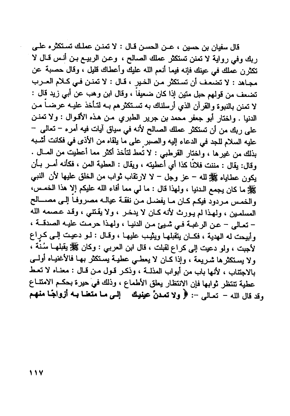 وعن الربيع بن أنس قال لا تكثرن عملك في عينك فإنه فيما أنعم اللَّه عليك وأعطاك قليل، وقال حصبة عن مجاهد: لا تضعف أن تستكثر من الخير، قال: لا تمنن في كلام العرب تضعف من قولهم حبل متين إذا كان ضعيفا، وقال ابن وهب عن أبي زيد قال: