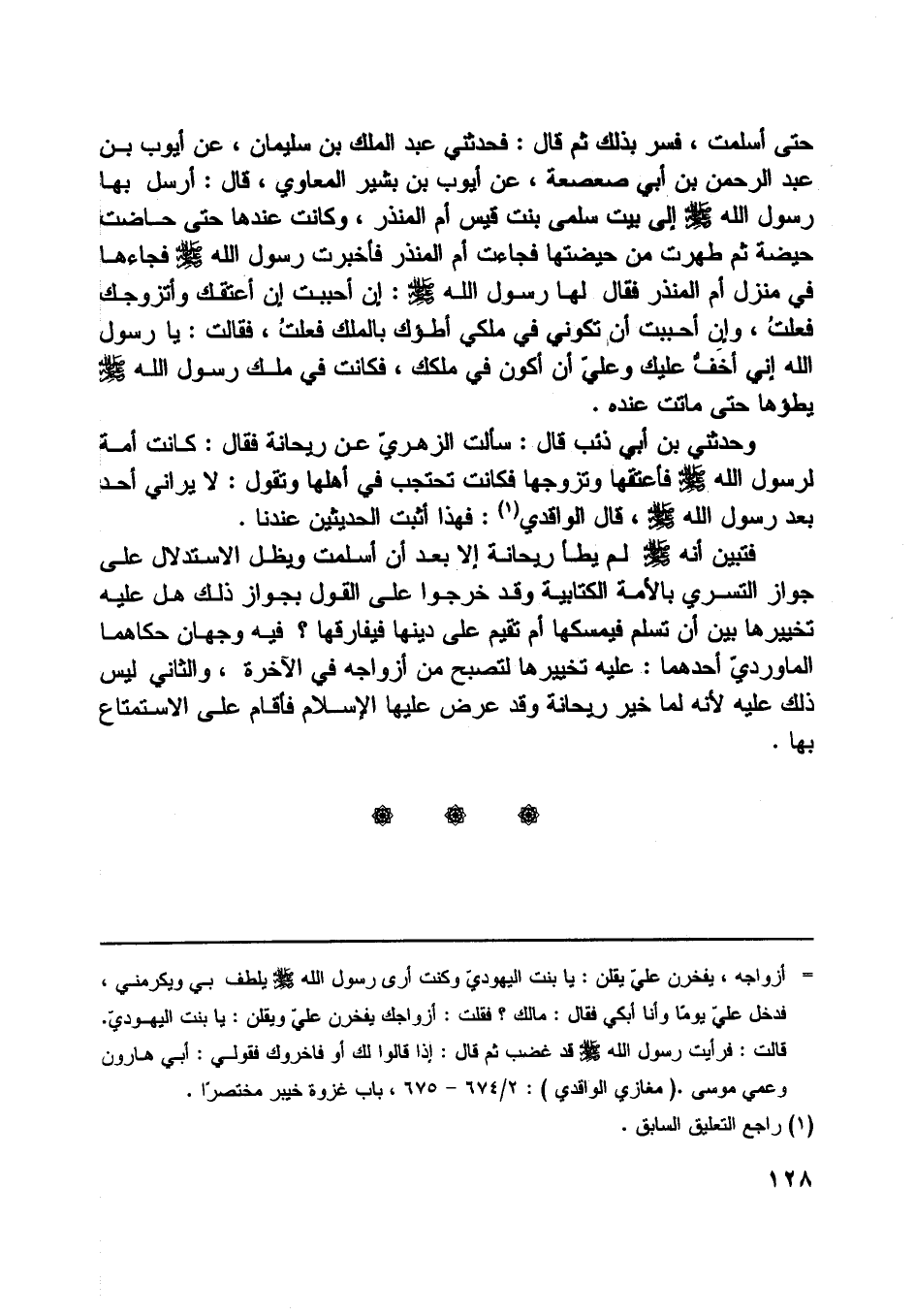 حتى أسلمت، فسر بذلك ثم قال: فحدثني عبد الملك بن سليمان، عن أيوب بن عبد الرحمن بن أبي صعصعة، عن أيوب بن بشير المعاوي، قال: أرسل بها رسول اللَّه صلّى اللَّه عليه وسلّم إلى بيت سلمى بنت قيس أم المنذر، وكانت عندها حتى حاضت حيضة ثم طهرت من حيضتها فجاءت أم المنذر فأخبرت رسول اللَّه صلّى اللَّه عليه وسلّم فجاءها في منزل أم المنذر فقال لها رسول اللَّه صلّى اللَّه عليه وسلّم: إن أحببت إن أعتقك وأتزوجك فعلت، وإن أحببت أن تكوني في ملكي أطؤك بالملك فعلت، فقالت: يا رسول اللَّه إني أخفّ عليك وعليّ أن أكون في ملكك، فكانت في ملك رسول اللَّه صلّى اللَّه عليه وسلّم يطؤها حتى ماتت عنده.
