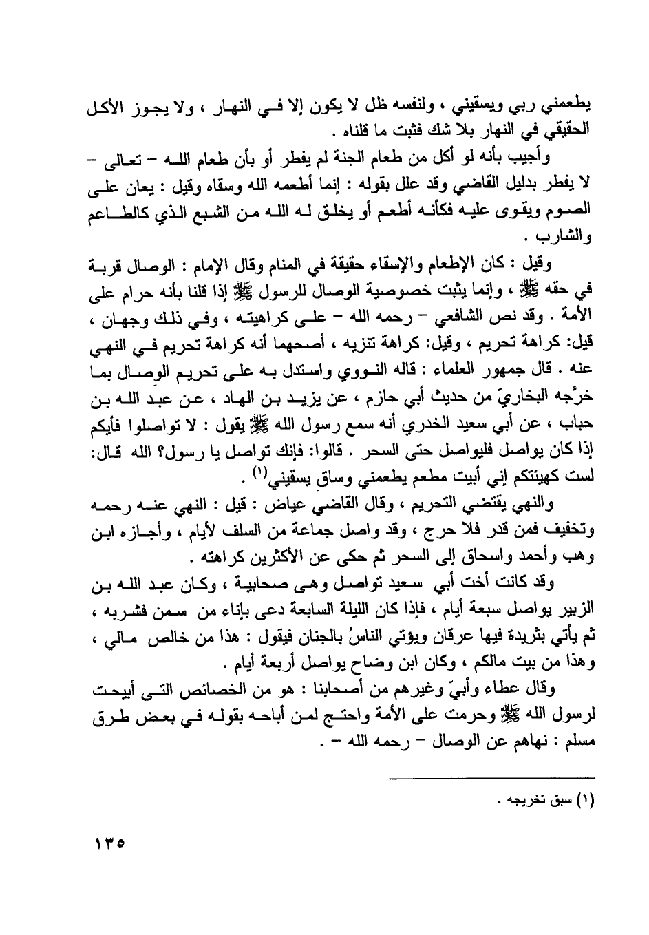 وقيل: كان الإطعام والإسقاء حقيقة في المنام وقال الإمام: الوصال قربة في حقه صلّى اللَّه عليه وسلّم، وإنما يثبت خصوصية الوصال للرسول صلّى اللَّه عليه وسلّم إذا قلنا بأنه حرام على الأمة. وقد نص الشافعيّ- رحمه اللَّه- على كراهيته، وفي ذلك وجهان، قيل: كراهة تحريم، وقيل: كراهة تنزيه، أصحهما أنه كراهة تحريم في النهي عنه. قال جمهور العلماء: قاله النووي واستدل به على تحريم الوصال بما