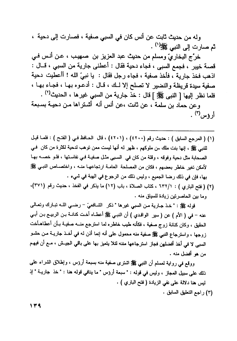 [ (1) ] (المرجع السابق) : حديث رقم (4200) ، (4201) ، قال الحافظ في (الفتح) : فلما قيل للنّبيّ صلّى اللَّه عليه وسلّم، إنها بنت ملك من ملوكهم، ظهر له أنها ليست ممن توهب لدحية لكثرة من كان في الصحابة مثل دحية وفوقه، وقلة من كان في السبي مثل صفية في نفاستها، فلو خصه بها لأمكن تغير خاطر بعضهم، فكان من المصلحة العامة ارتجاعها منه، واختصاص النبي صلّى اللَّه عليه وسلّم بها، فإن في ذلك رضا الجميع، وليس ذلك من الرجوع في الهبة في شيء.