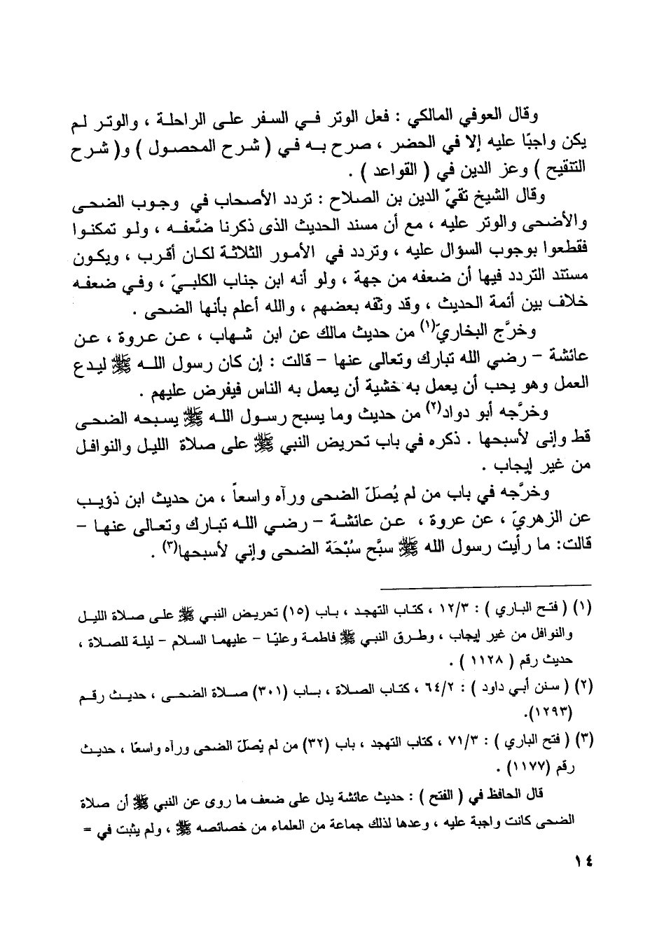 [ (3) ] (فتح الباري) : 3/ 71، كتاب التهجد، باب (32) من لم يصلّ الضحى ورآه واسعا، حديث رقم (1177) .
