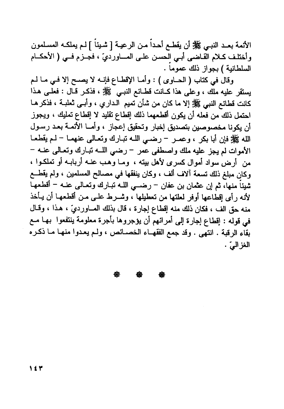 وقال في كتاب (الحاوي) : وأما الإقطاع فإنه لا يصح إلا في ما لم يستقر عليه ملك، وعلى هذا كانت قطائع النبي صلّى اللَّه عليه وسلّم، فذكر قال: فعلى هذا كانت قطائع النبي صلّى اللَّه عليه وسلّم إلا ما كان من شأن تميم الداريّ، وأبى ثعلبة، فذكرها احتمل ذلك من فعله أن يكون أقطعهما ذلك إقطاع تقليد لا إقطاع تمليك، ويجوز أن يكونا مخصوصين بتصديق إخبار وتحقيق إعجاز، وأما الأئمة بعد رسول اللَّه صلّى اللَّه عليه وسلّم فإن أبا بكر، وعمر- رضي اللَّه تبارك وتعالى عنهما- لم يقطعا الأموات لم يجز عليه ملك واصطفى عمر- رضي اللَّه تبارك وتعالى عنه- من أرض سواد أموال كسرى لأهل بيته، وما وهب عنه أربابه أو تملكوا، وكان مبلغ ذلك تسعة آلاف ألف، وكان ينفقها في مصالح المسلمين، ولم يقطع شيئا منها، ثم إن عثمان بن عفان- رضي اللَّه تبارك وتعالى عنه- أقطعها لأنه رأى إقطاعها أوفر لعلتها من تعطيلها، وشرط على من أقطعها أن يأخذ منه حق ألف، فكان ذلك منه إقطاع إجارة، قال بذلك الماورديّ، هذا، وقال في قوله: إقطاع إجارة إلى أمرائهم أن يؤجروها بأجرة معلومة ينتفعوا بها مع بقاء الرقبة. انتهى. وقد جمع الفقهاء الخصائص، ولم يعدوا منها ما ذكره الغزاليّ.