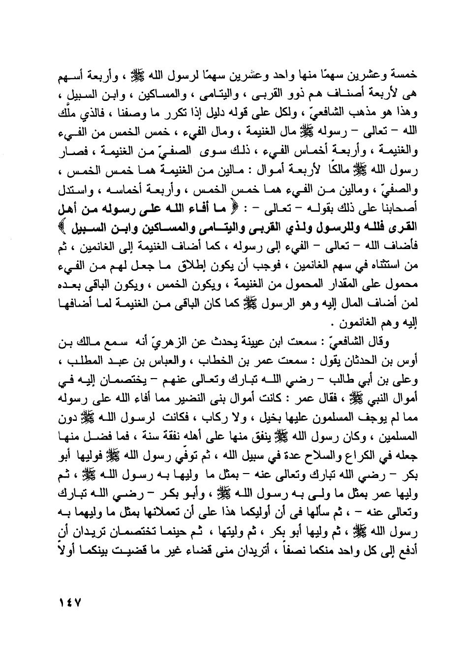 وقال الشافعيّ: سمعت ابن عيينة يحدث عن الزهريّ أنه سمع مالك بن أوس بن الحدثان يقول: سمعت عمر بن الخطاب، والعباس بن عبد المطلب، وعلى بن أبي طالب- رضي اللَّه تبارك وتعالى عنهم- يختصمان إليه في أموال النبي صلّى اللَّه عليه وسلّم، فقال عمر: كانت أموال بنى النضير مما أفاء اللَّه على رسوله مما لم يوجف المسلمون عليها بخيل، ولا ركاب، فكانت لرسول اللَّه صلّى اللَّه عليه وسلّم دون المسلمين، وكان رسول اللَّه صلّى اللَّه عليه وسلّم ينفق منها على أهله نفقة سنة، فما فضل منها جعله في الكراع والسلاح عدة في سبيل اللَّه، ثم توفي رسول اللَّه صلّى اللَّه عليه وسلّم فوليها أبو بكر- رضي اللَّه تبارك وتعالى عنه- بمثل ما وليها به رسول اللَّه صلّى اللَّه عليه وسلّم، ثم وليها عمر بمثل ما ولى به رسول اللَّه صلّى اللَّه عليه وسلّم، وأبو بكر- رضي اللَّه تبارك وتعالى عنه-، ثم سألها في أن أوليكما هذا على أن تعملانها بمثل ما وليهما به رسول اللَّه صلّى اللَّه عليه وسلّم، ثم وليها أبو بكر، ثم وليتها، ثم حينما تختصمان تريدان أن أدفع إلى كل واحد منكما نصفا، أتريدان منى قضاء غير ما قضيت بينكما أولا