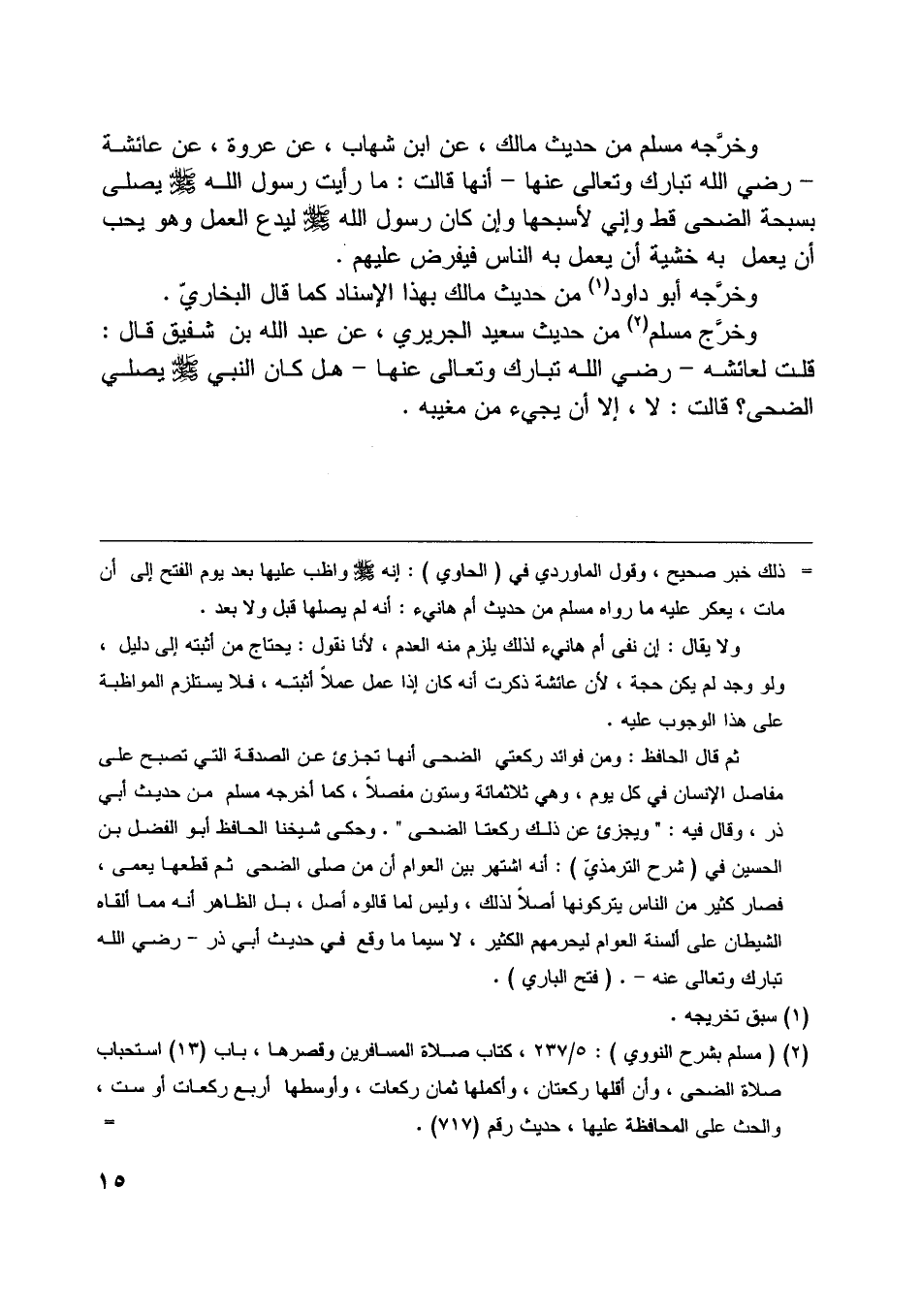 [ (2) ] (مسلم بشرح النووي) : 5/ 237، كتاب صلاة المسافرين وقصرها، باب (13) استحباب صلاة الضحى، وأن أقلها ركعتان، وأكملها ثمان ركعات، وأوسطها أربع ركعات أو ست، والحث على المحافظة عليها، حديث رقم (717) .