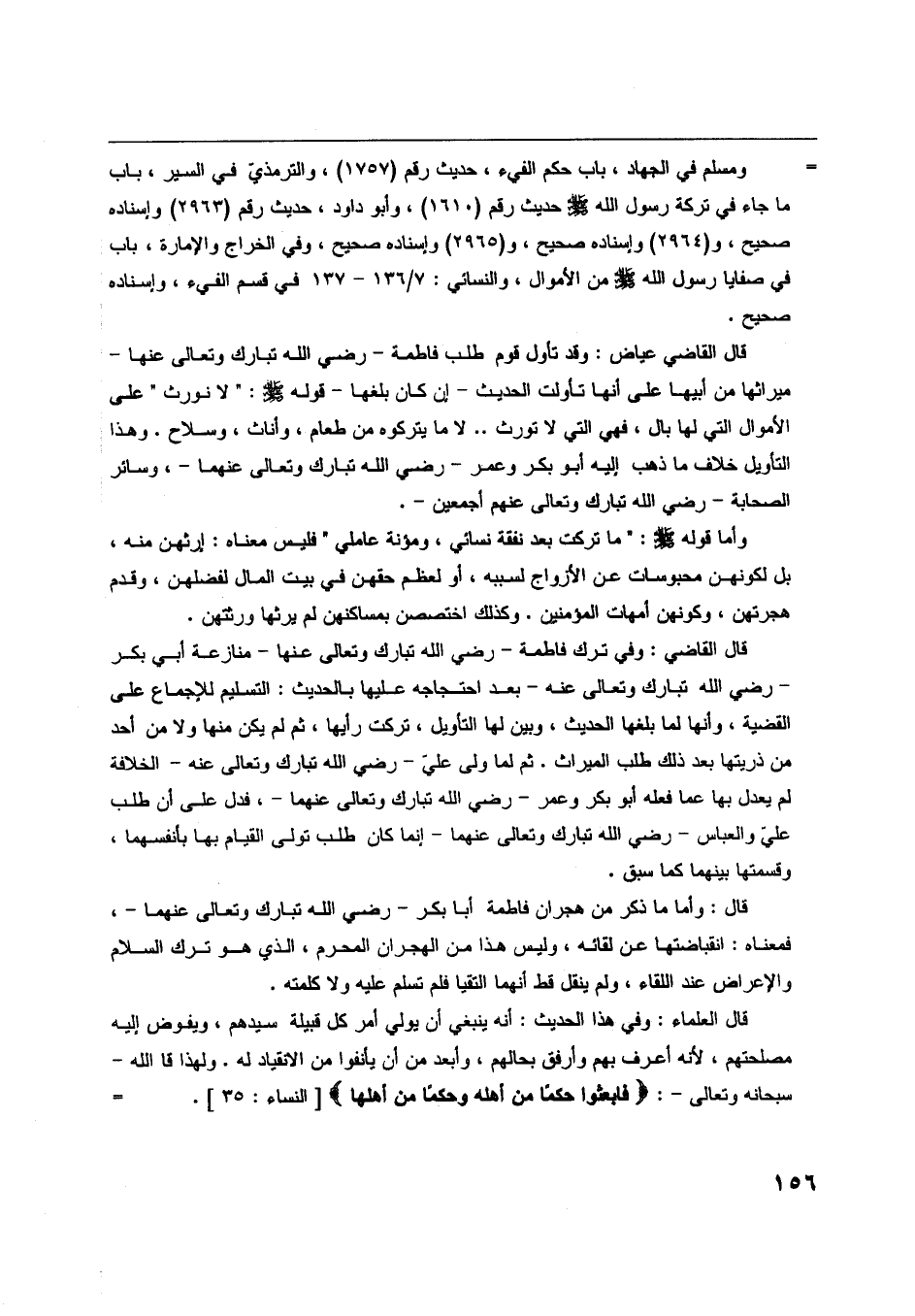 قال القاضي عياض: وقد تأول قوم طلب فاطمة- رضي اللَّه تبارك وتعالى عنها- ميراثها من أبيها على أنها تأولت الحديث- إن كان بلغها- قوله صلّى اللَّه عليه وسلّم: «لا نورث» على الأموال التي لها بال، فهي التي لا تورث.. لا ما يتركوه من طعام، وأناث، وسلاح. وهذا التأويل خلاف ما ذهب إليه أبو بكر وعمر- رضي اللَّه تبارك وتعالى عنهما-، وسائر الصحابة- رضي اللَّه تبارك وتعالى عنهم أجمعين-.