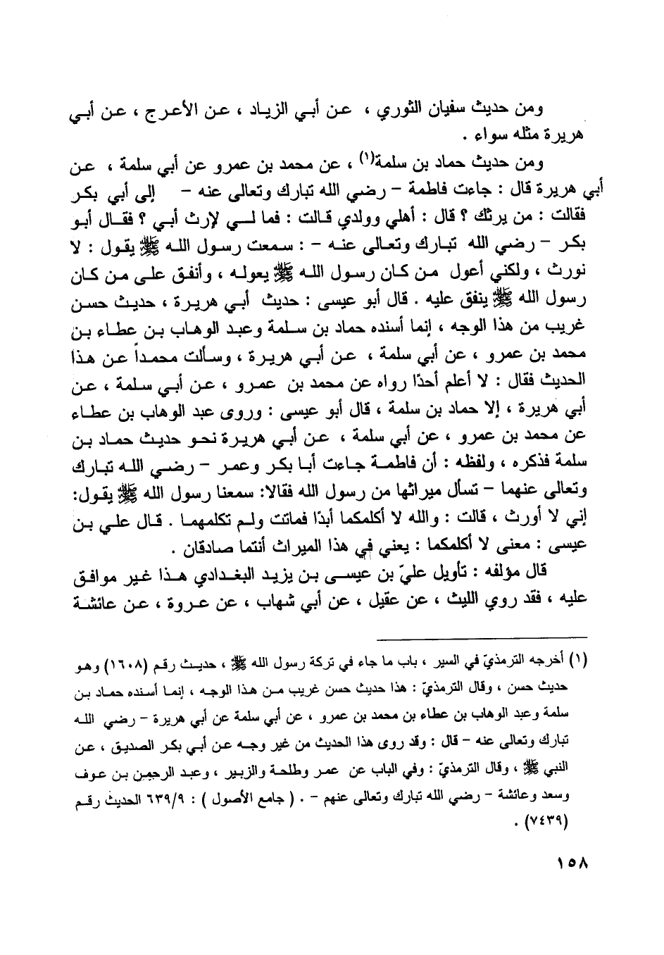 [ (1) ] أخرجه الترمذيّ في السير، باب ما جاء في تركة رسول اللَّه صلّى اللَّه عليه وسلّم، حديث رقم (1608) وهو حديث حسن، وقال الترمذيّ: هذا حديث حسن غريب من هذا الوجه، إنما أسنده حماد بن سلمة وعبد الوهاب بن عطاء بن محمد بن عمرو، عن أبي سلمة عن أبي هريرة- رضي اللَّه تبارك وتعالى عنه- قال: وقد روى هذا الحديث من غير وجه عن أبي بكر الصديق، عن النبي صلّى اللَّه عليه وسلّم، وقال الترمذيّ: وفي الباب عن عمر وطلحة والزبير، وعبد الرحمن بن عوف وسعد وعائشة- رضي اللَّه تبارك وتعالى عنهم-. (جامع الأصول) : 9/ 639 الحديث رقم (7439) .