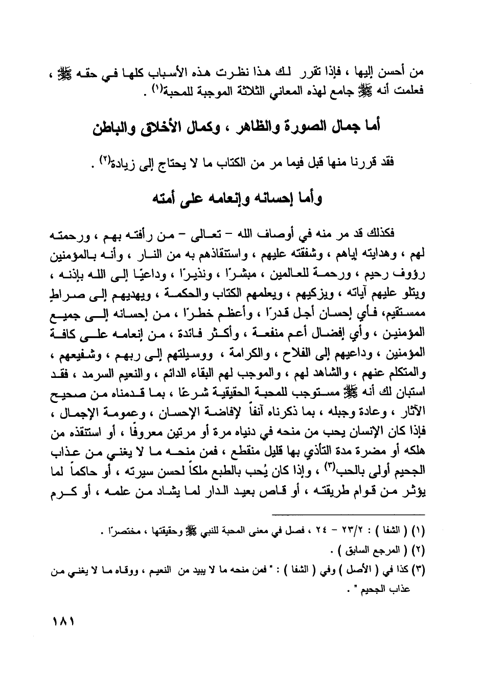 [ (1) ] (الشفا) : 2/ 23- 24، فصل في معنى المحبة للنّبيّ صلّى اللَّه عليه وسلّم وحقيقتها، مختصرا.